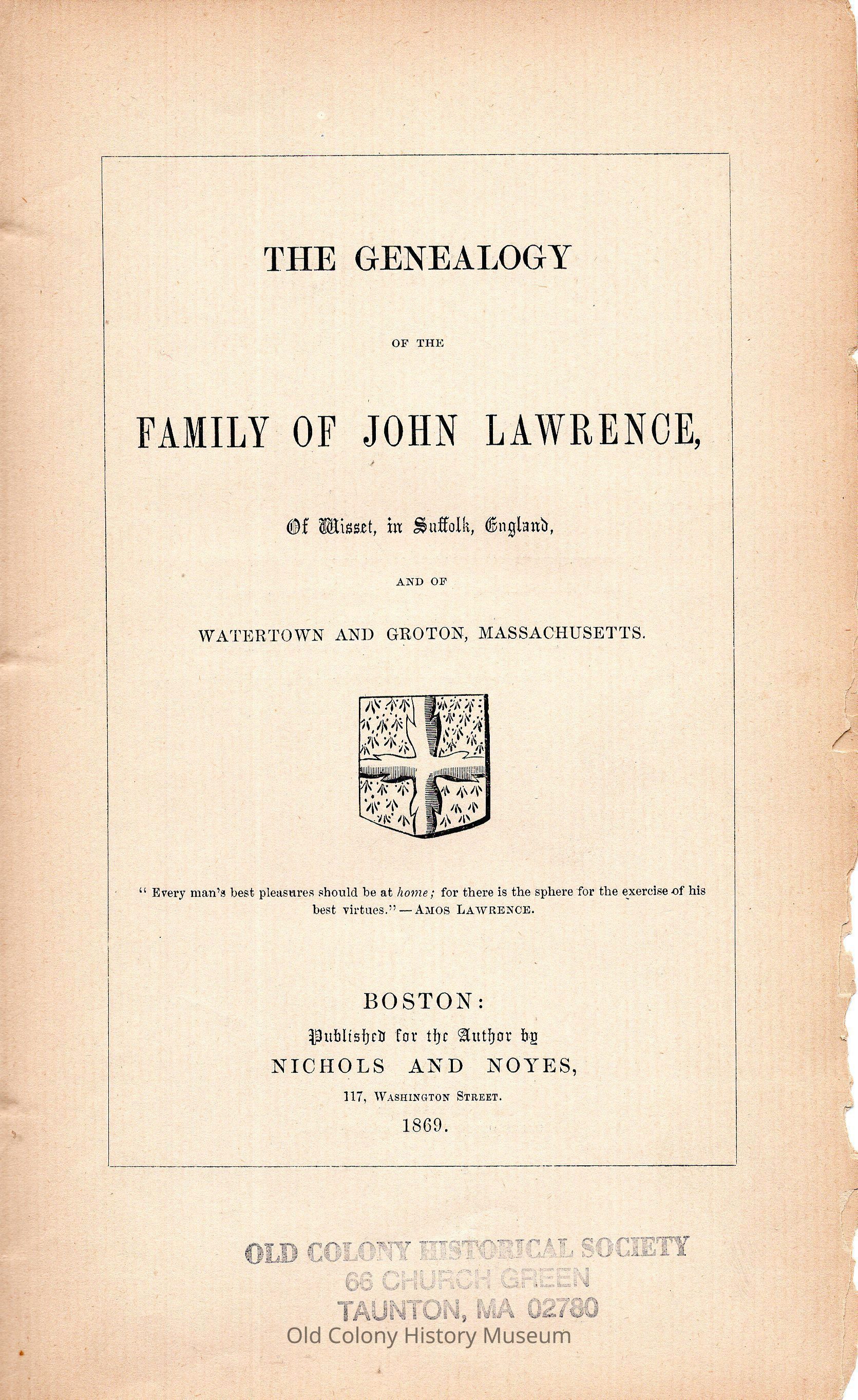 The Genealogy of the Family of John Lawrence of Wisset in Suffolk, England, and of Watertown and Groton, MassachusettsEntry/Object ID