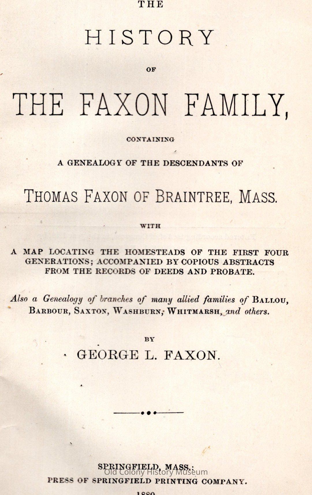 The History of the Faxon Family: Containing a Genealogy of the Descendants of Thomas Faxon of Braintree, Mass.Entry/Object ID