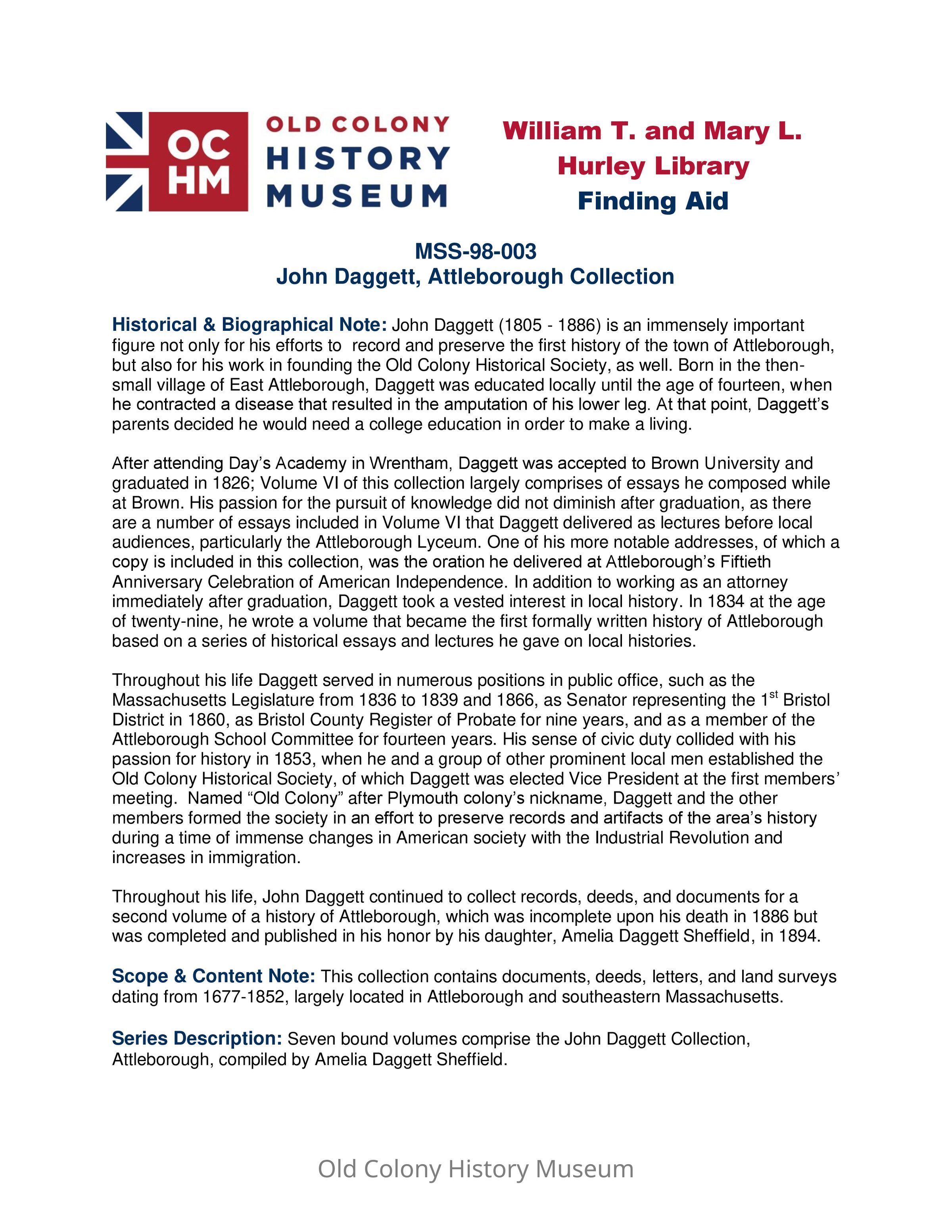 Throughout his life, John Daggett continued to collect records, deeds, and documents for a second volume of a history of Attleborough, which was incomplete upon his death in 1886 but was completed and published in his honor by his daughter, Amelia Daggett Sheffield, in 1894.Archive Details