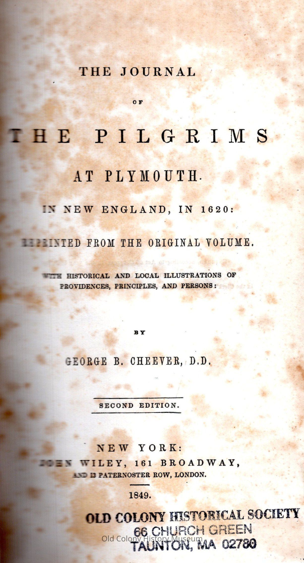With Historical and local illustrations of providences, principles, and persons: by George B. Cheever, D.D. 2d ed. With reproduction of original t.-p.: A relation or journall of the beginning and proceedings of the English plantation setled at Plymoth in New England, by certaine English adventurers both merchants and others . . . London, Printed for John Bellamie and are to be sold at his shop at the Two greyhounds in Cornhill neere the Royall exchange. 1622 "To the reader" (p. (13) - (14)) signed: G. Movrt. The main part of the narrative waws probably written by Edward Winslow. Parts have been attributed to William Bradford. G. Mourt (George Morton?) by whose name the relation is commonly known, seems to have had no other connection wth it than that of writing the preface and giving the book to the press. cf. Young, A. Chronicles of the Pilgrim fathers. Boston, 1841, P. vii - viii; Mourt's relation. A journal of the Pilgrims at Plymouth. New York (1963) p. x - xv.