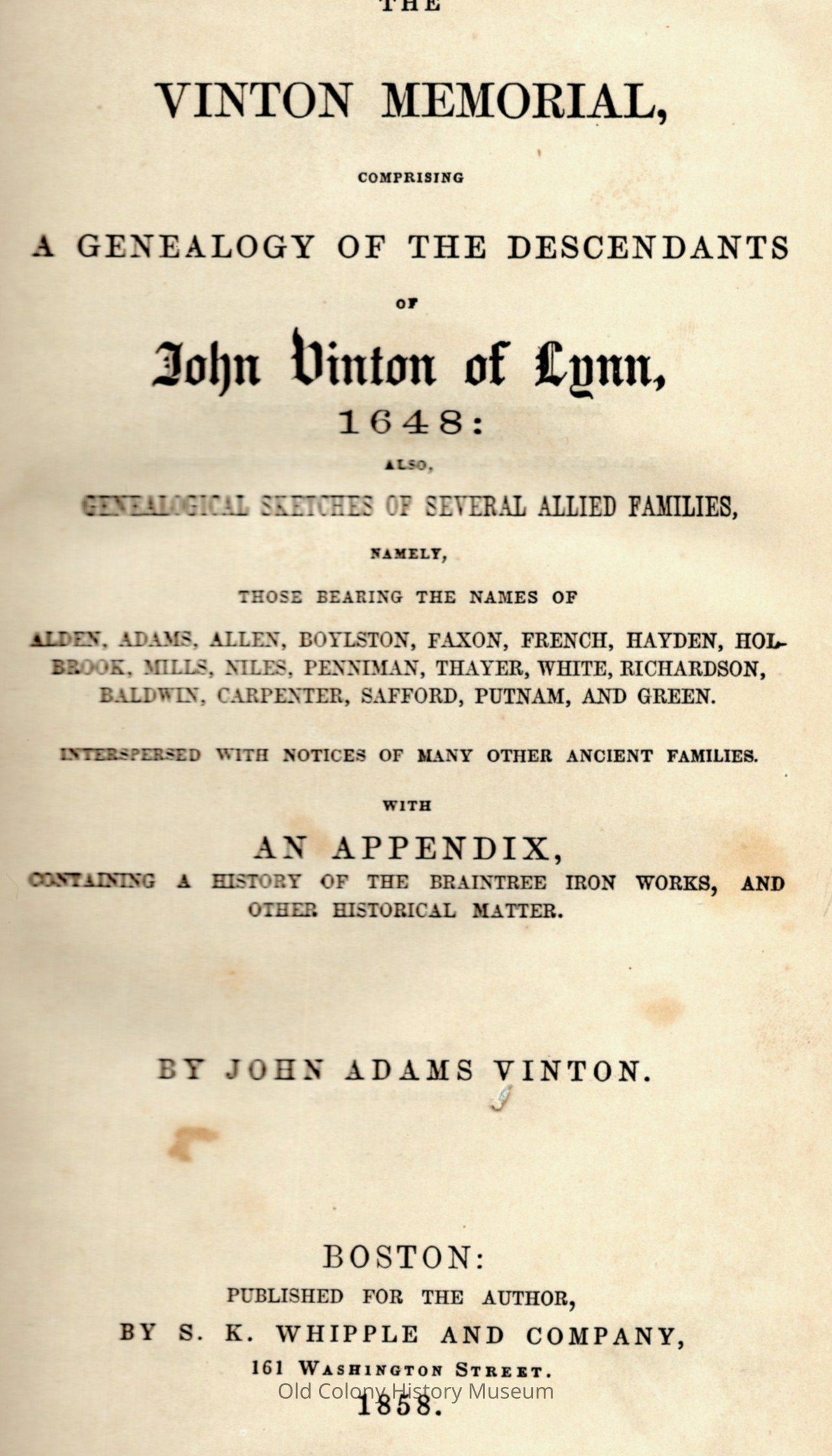 The Vinton Memorial, Comprising a Genealogy of the Descendants of John Vinton of Lynn, 1648; also, Genealogical Sketches of Several Allied Families...With an appendix containing a history of the Braintree iron works, and other historical matterEntry/Object ID