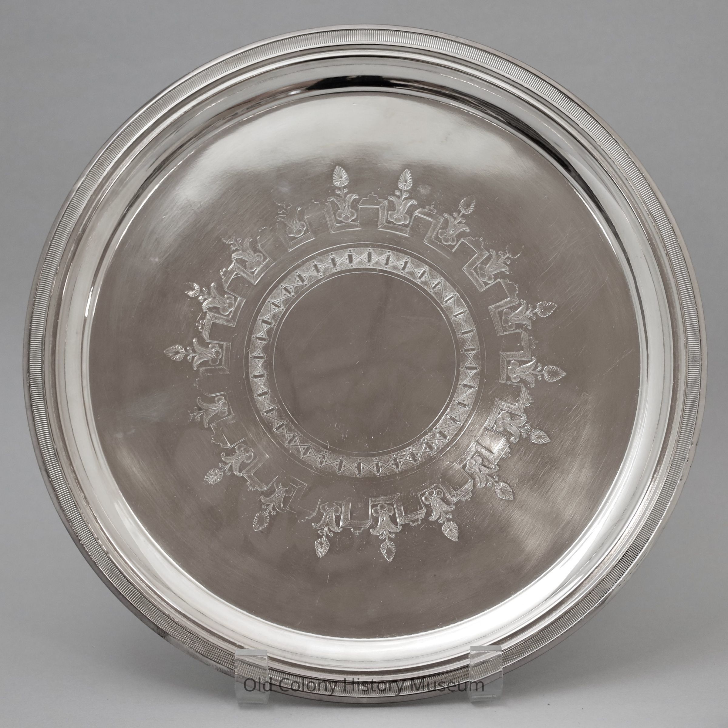 Circular tray with rolled mount edge. Two decorative bands pressed in center. Alternating keys and floral scrolls.