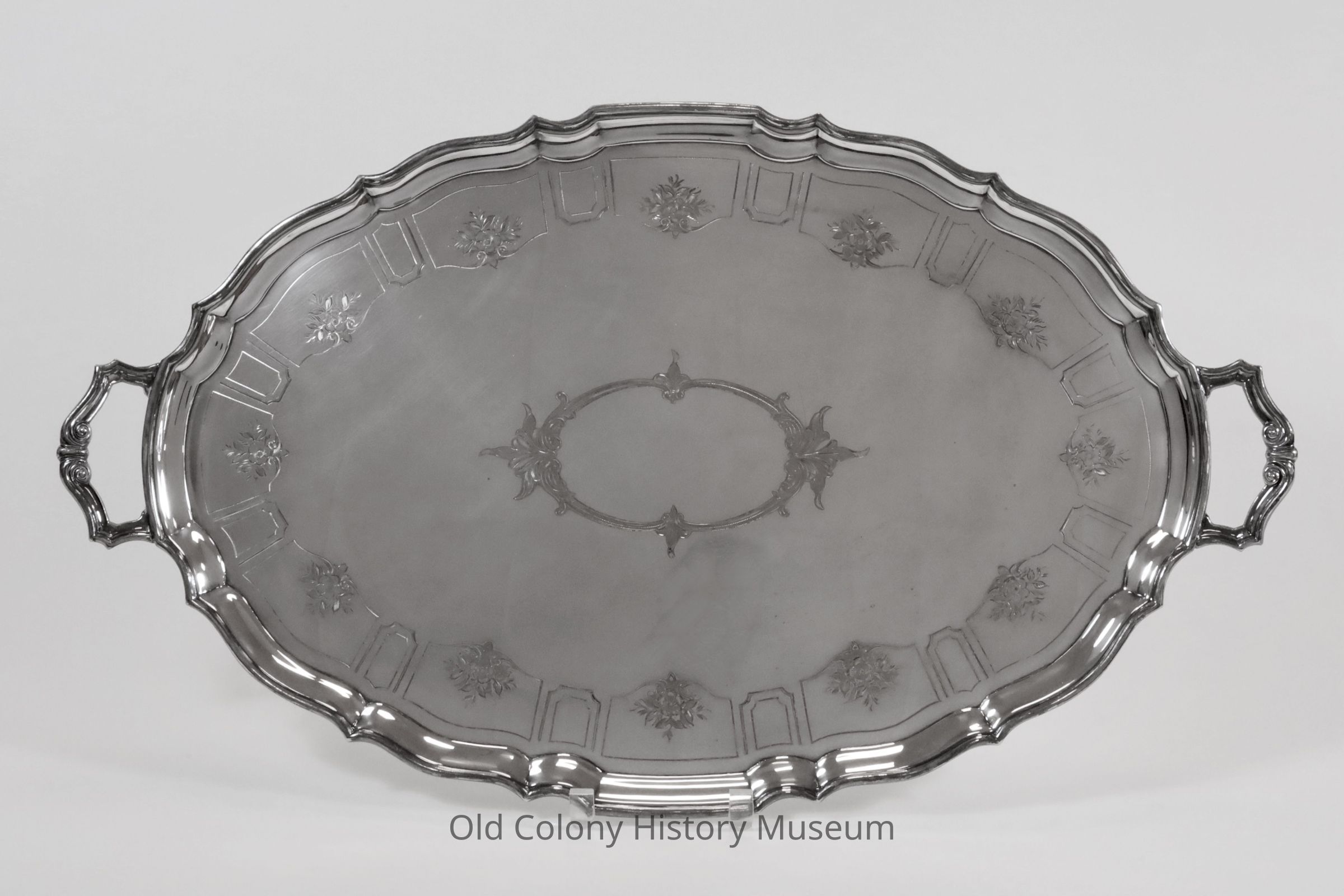 Reed & Barton electroplated two-handled tray. Electroplated nickel silver. Raised molded cyma curved edges. Angular handle at each side with scroll accents. Center engraved with empty oval scroll and acanthus accented cartouche and another geometric border of alternating primrose accented and plain panels.
