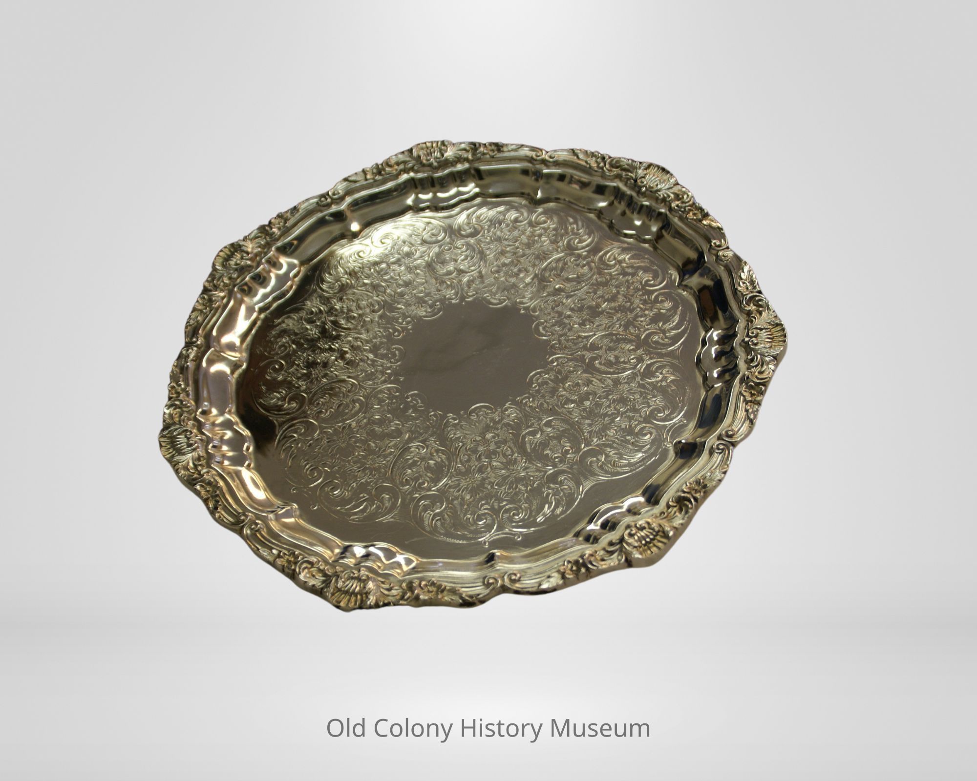 Silver plated on copper tray, footed and machine-embossed; made by Poole Silver Co., #3208. Circular cast footed tray with cast scalloped rim and machine embossed floral design on bottom.Lexicon