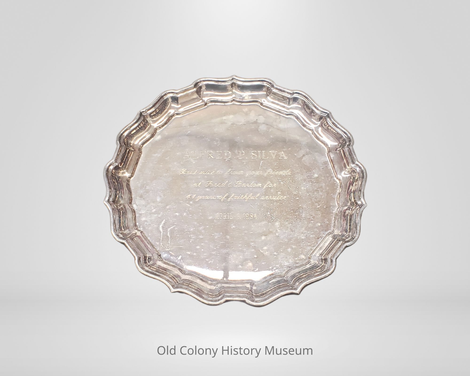 Silver plate commemorative serving tray; Chippendale-style rim; engraved on the front "ALFRED P. SILVA Best wishes from your friends at Reed & Barton for 41 years of faithful service APRIL 1, 1984"; back is stamped "REED & BARTON 158 Chippendale".
