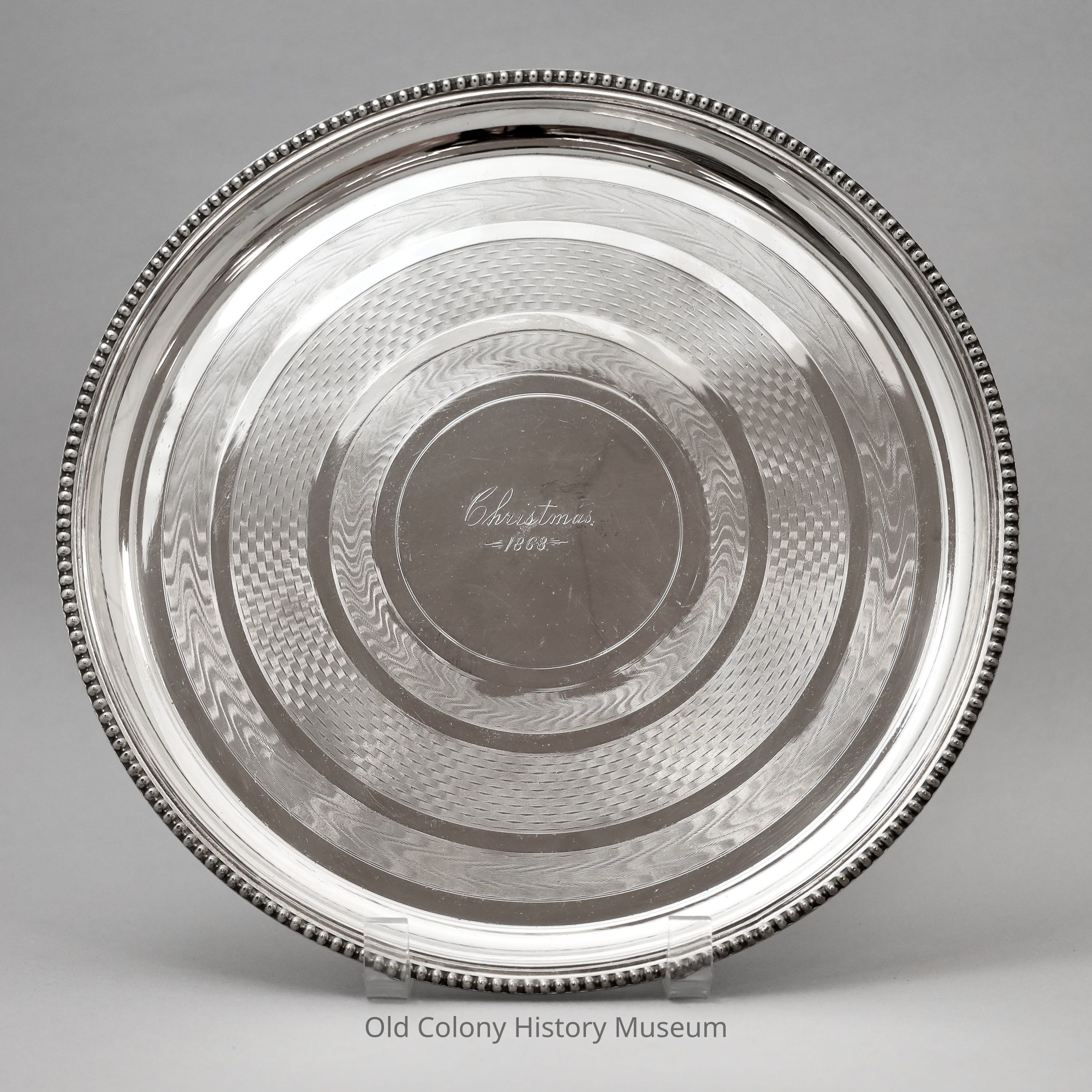 Circular tray with three bands of engine turning and beaded edge. Center engraved "Christmas 1868".