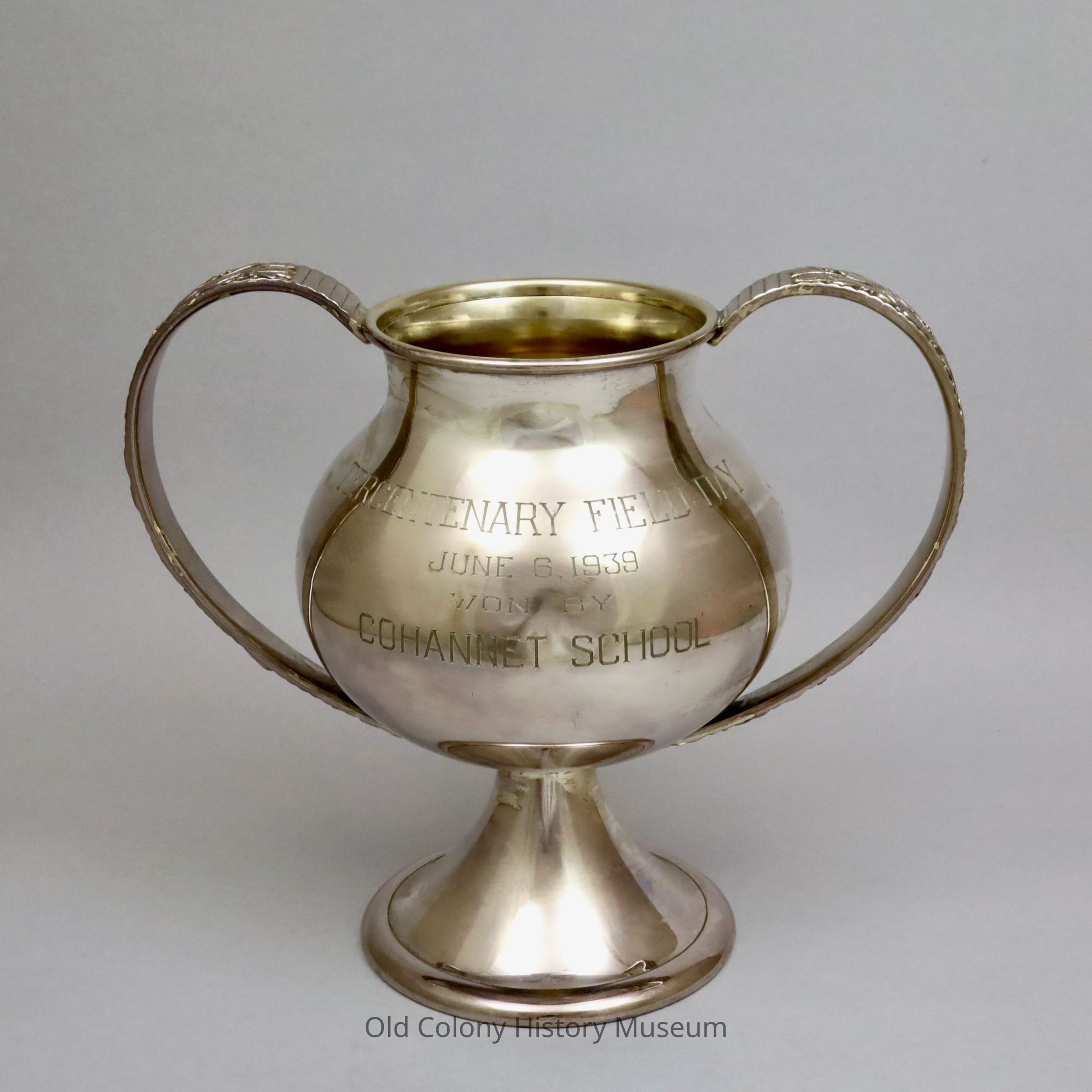 Cohannet School Trophy, 1939; made by Reed & Barton. Bulbous shaped cup on round pedestal base. Rolled rim and two flanking ear-shaped handles which are decorated with laurel leaves. Piece says: "Tercentenary Field Day June 6, 1939 Won by Cohannet School."Lexicon