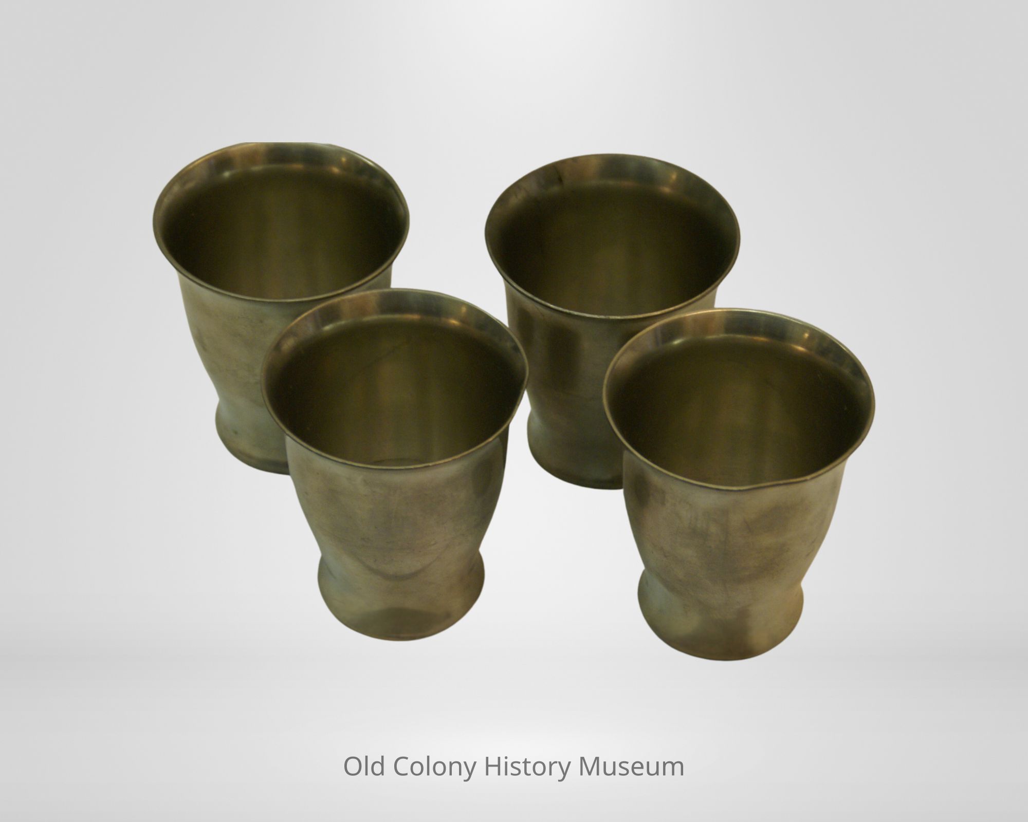 Four pewter tumblers #717, mfgd. by F.B. Rogers. Each circular vessel has slightly bellied body, flared lip and flat base.Lexicon