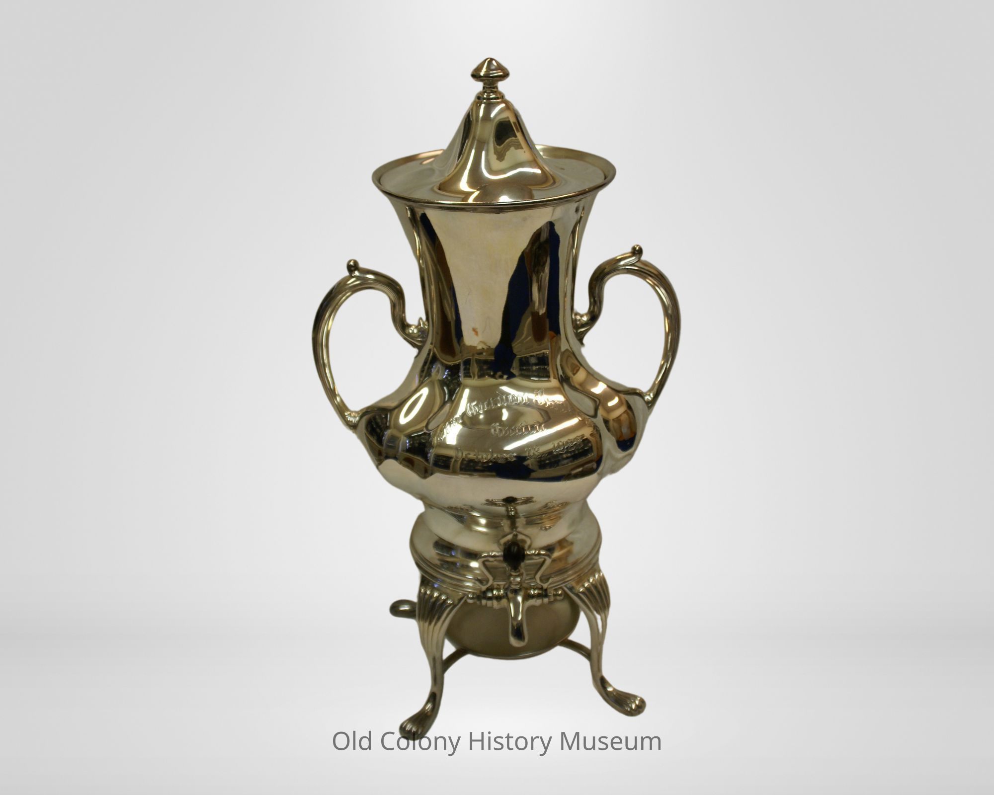 a-1) Silverplate coffee urn; bulbous body with flared lip; front engraved "Jean Gordon Jackson Guild October 18, 1928"; protruding spout with bead topped flange finial; s-curved handle with reeded wood ferrule. 2 c-shaped handles each accented with scrooled spur; 4 cabriole legs with gadrooned paw feet. a-2) high domed lid with banded knob finial. b-1) squat bulbous burner with molded rim and ring handle; 2 circular cut-outs for wicks. b-2 & b-3) two cotton wicks each encased in a cylindrical silver holder with reeded flanged top; helmet shaped covers with skewer like handlesMade/Created