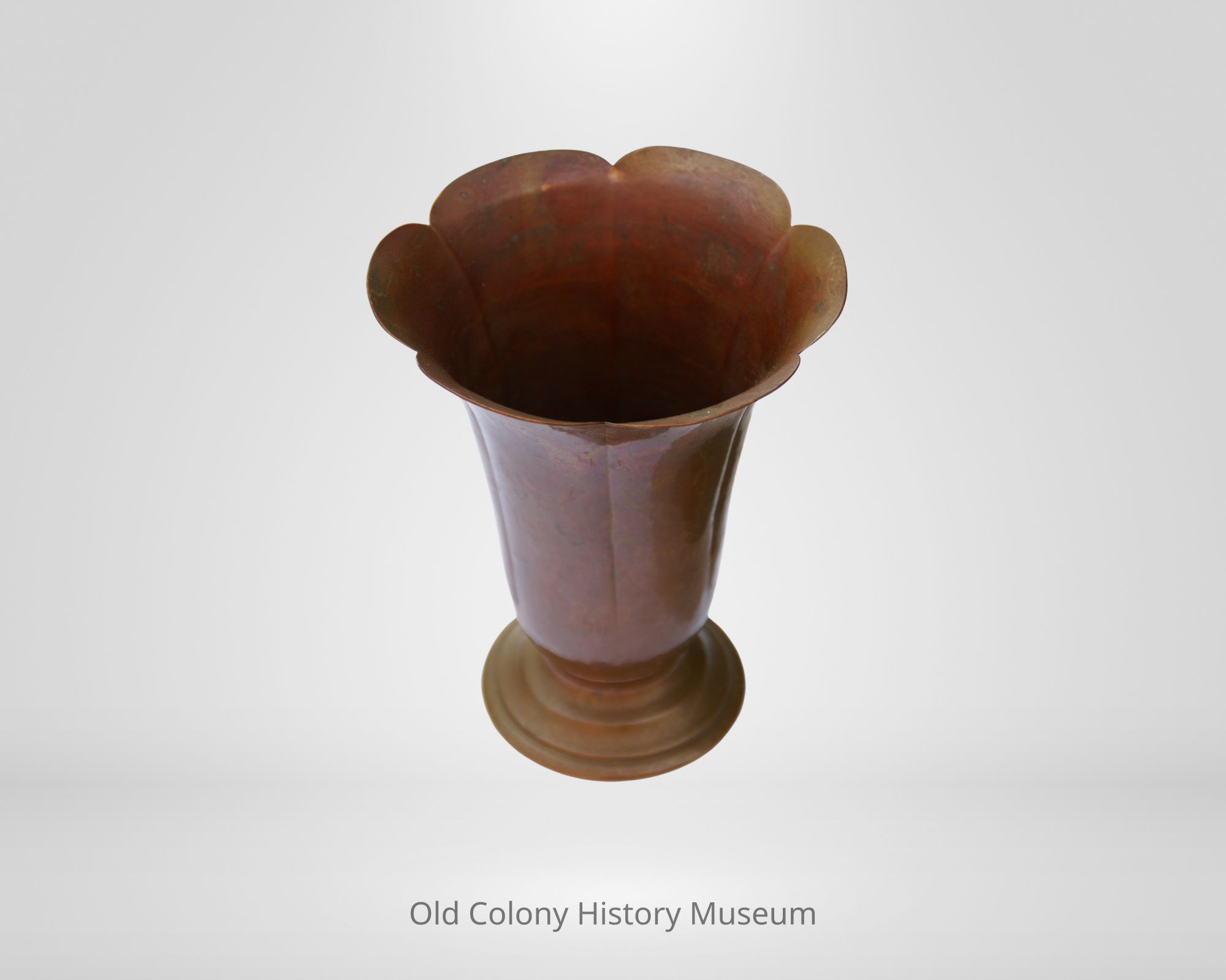 Vase with a circular base with a beveled edge. Bottom of vase is open. 6 large petals rise up from the base. Along the body of the base, a slightly indented line denotes each of the 6 petals that end at the top in a scalloped edging going around the piece. Signed: (1) "LH" over "V" (2) "L.H. Vaughan, Taunton, Mass."Lexicon