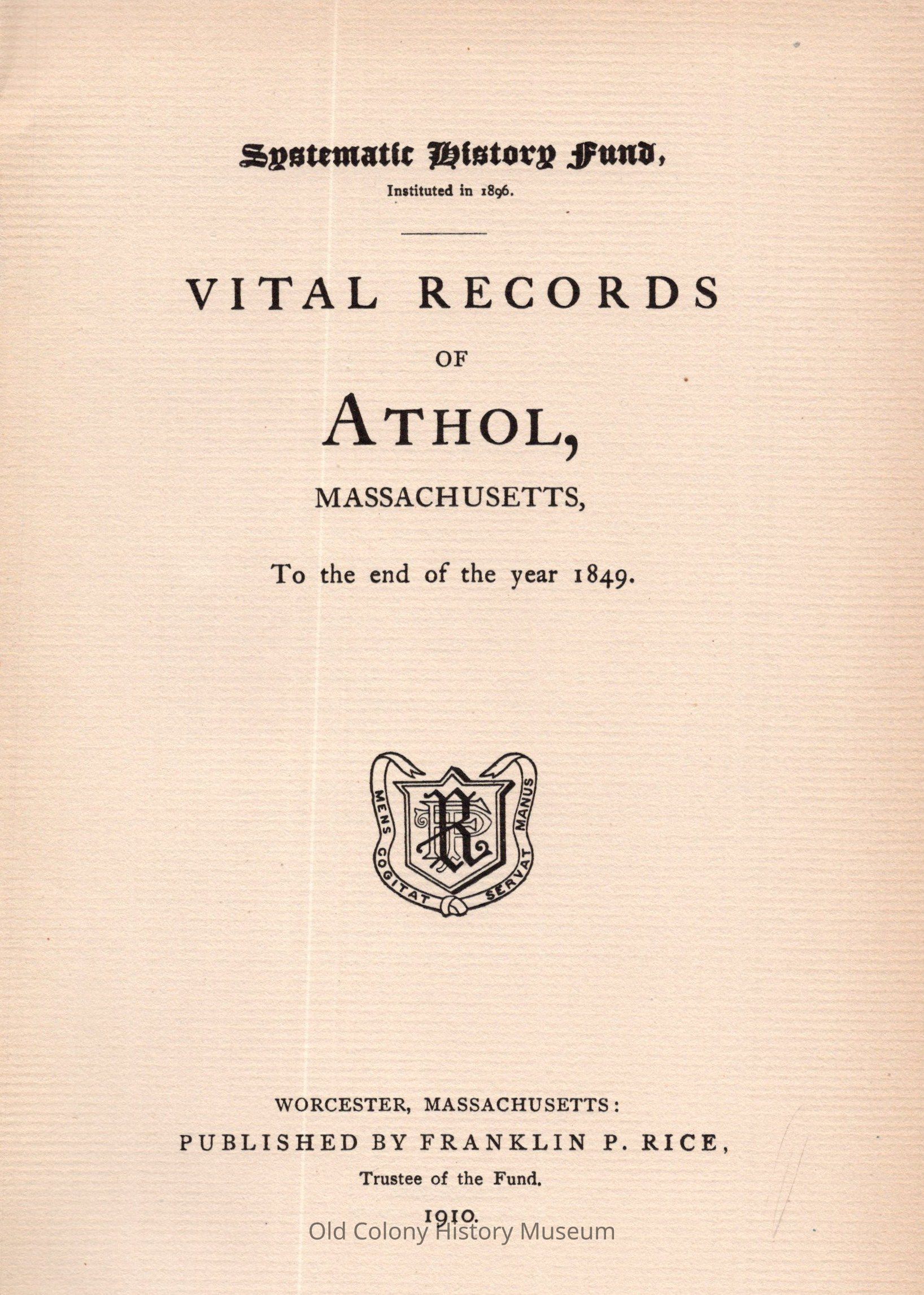 Vital Records of Athol, Massachusetts to the End of the Year 1849.Entry/Object ID