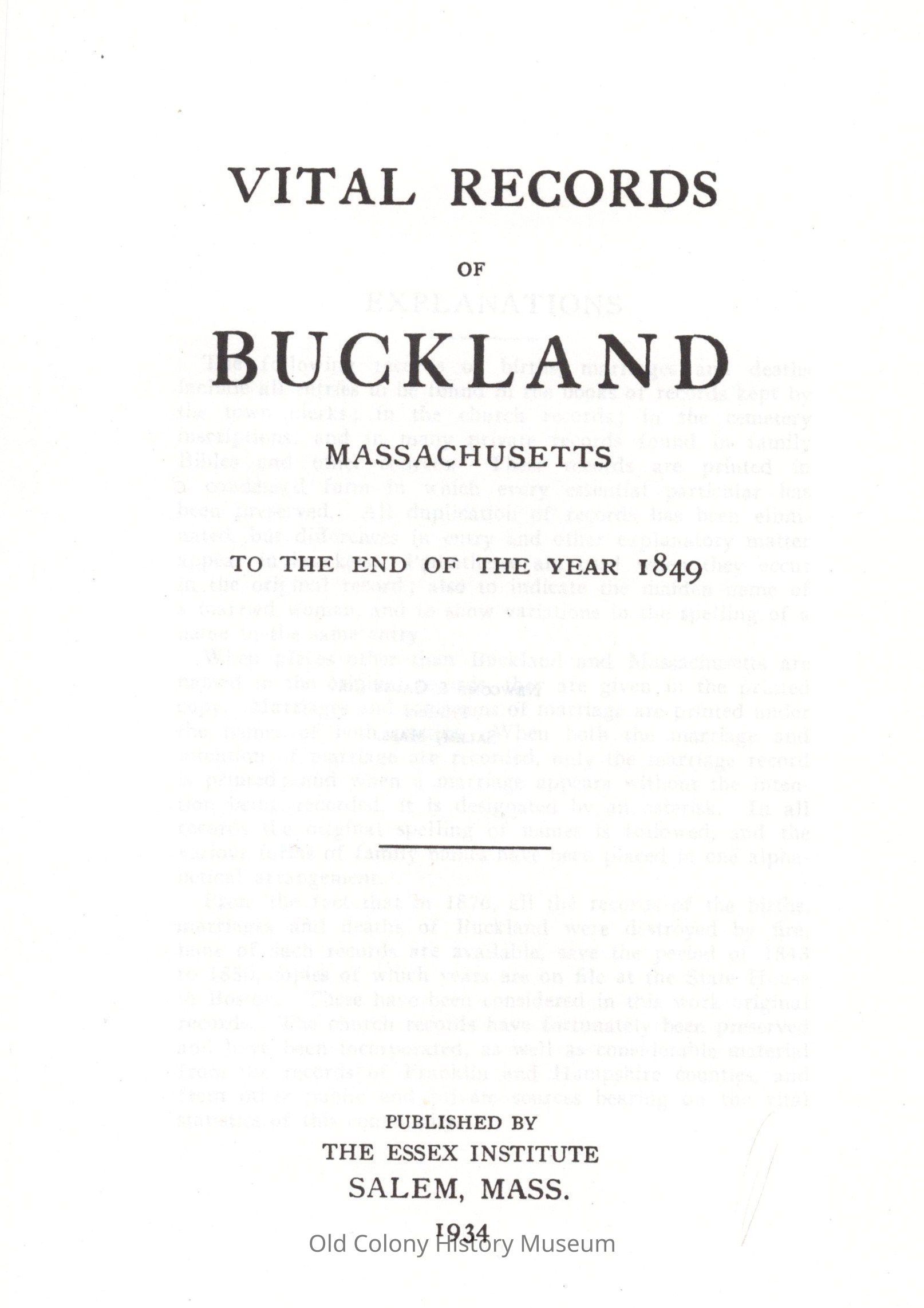 Vital Records of Buckland, Massachusetts to the End of the Year 1849.Entry/Object ID