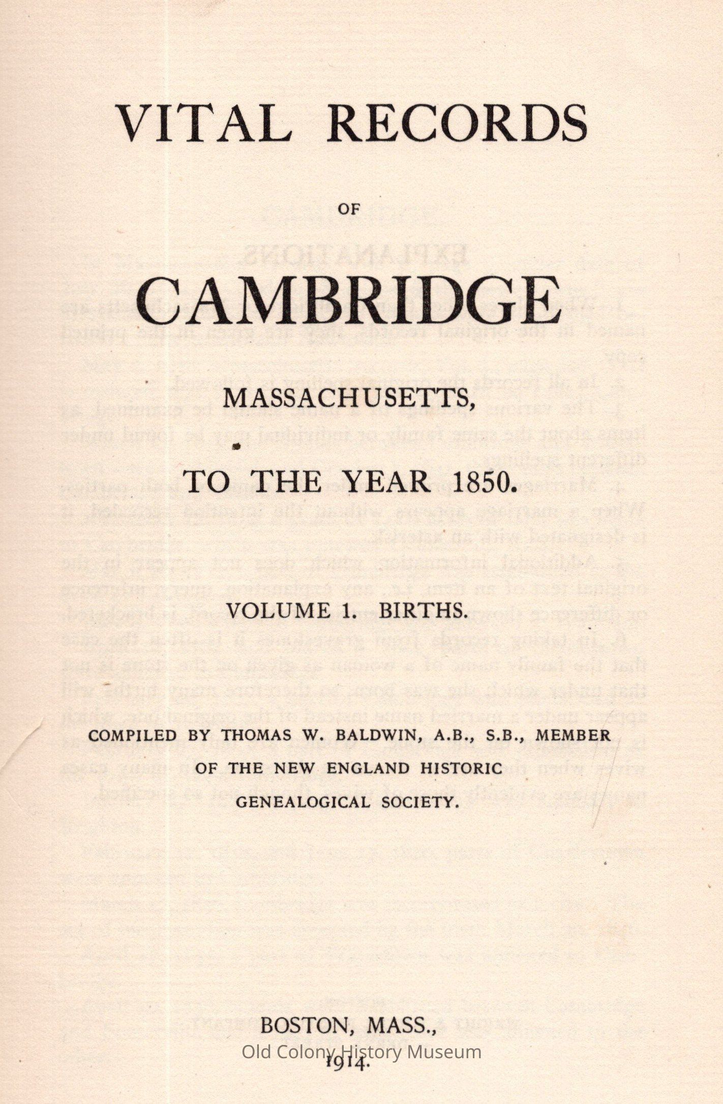1. Registers of births, etc.--Cambridge, Mass.Book Details