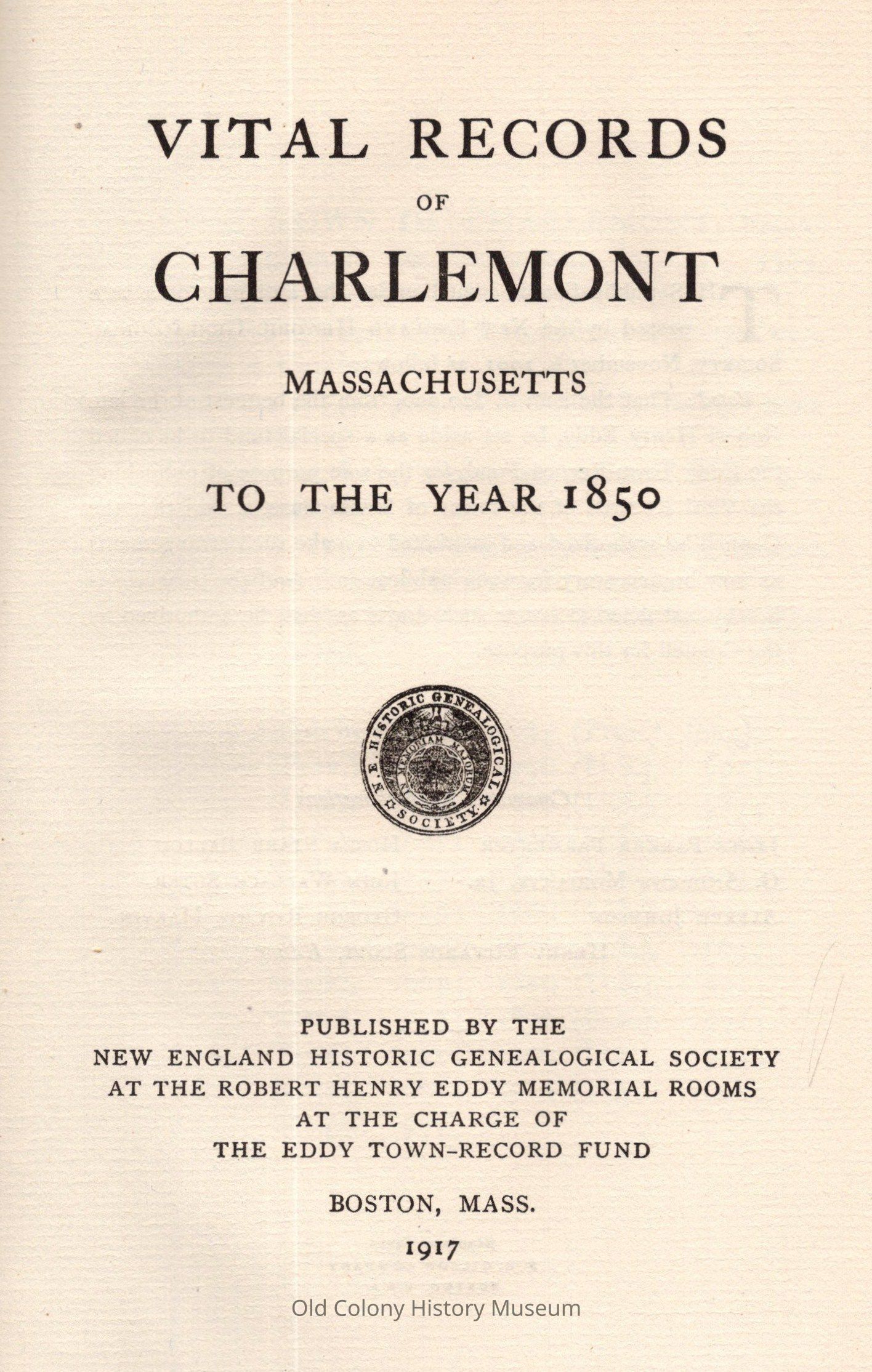 New England Historic Genealogical Society, at the charge of the Eddy town record fundPlace Published