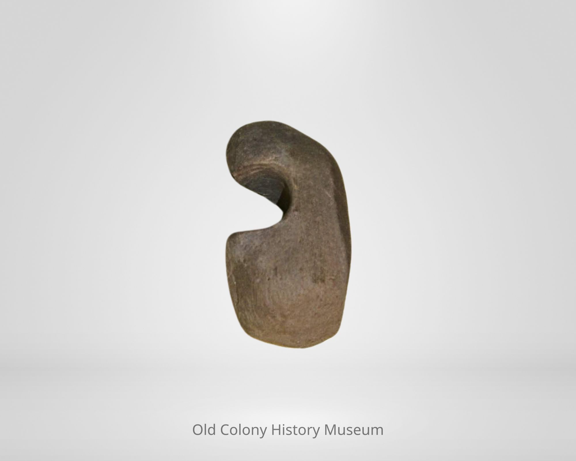 Gray stone, broken on top, with drilled center; dark stain on back side; used to throw a spear