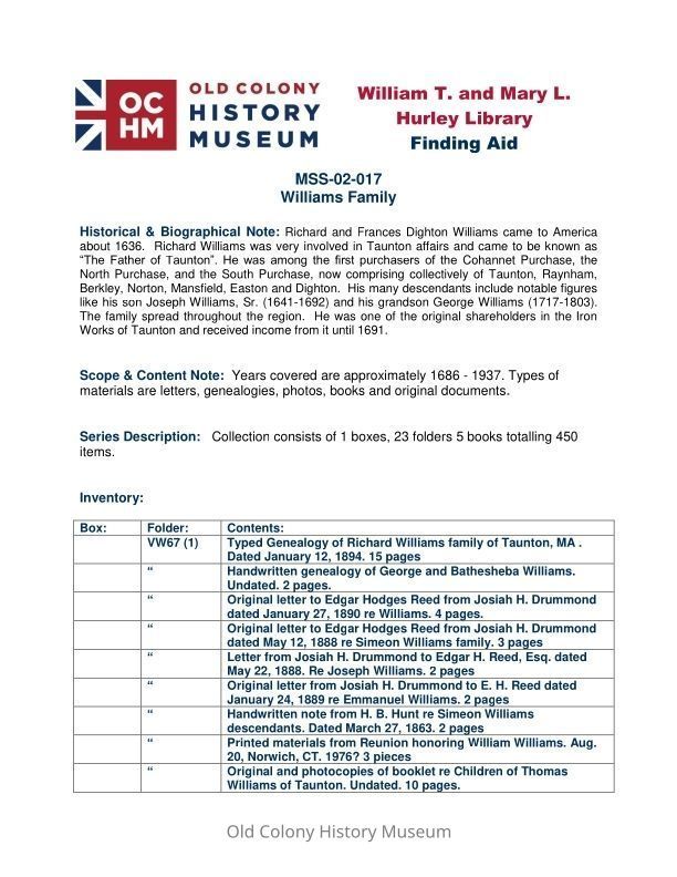Richard and Frances Dighton Williams came to America about 1636. Richard Williams was very involved in Taunton affairs and came to be known as “The Father of Taunton”. He was among the first purchasers of the Cohannet Purchase, the North Purchase, and the South Purchase, now comprising collectively of Taunton, Raynham, Berkley, Norton, Mansfield, Easton and Dighton. His many descendants include notable figures like his son Joseph Williams, Sr. (1641-1692) and his grandson George Williams (1717-1803). The family spread throughout the region. He was one of the original shareholders in the Iron Works of Taunton and received income from it until 1691.Archive Details