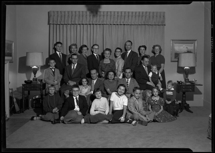 Negative, sheet film. 5 x 7 b&w. No. I-695. Family photo at Winifred Schmidt's home.