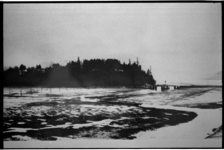 Negative, sheet film. 1 x 1.5 b&w. Oly Brewery.South end of Olympia harbor, looking east-southeast from west shore. Section of panoramic photo.