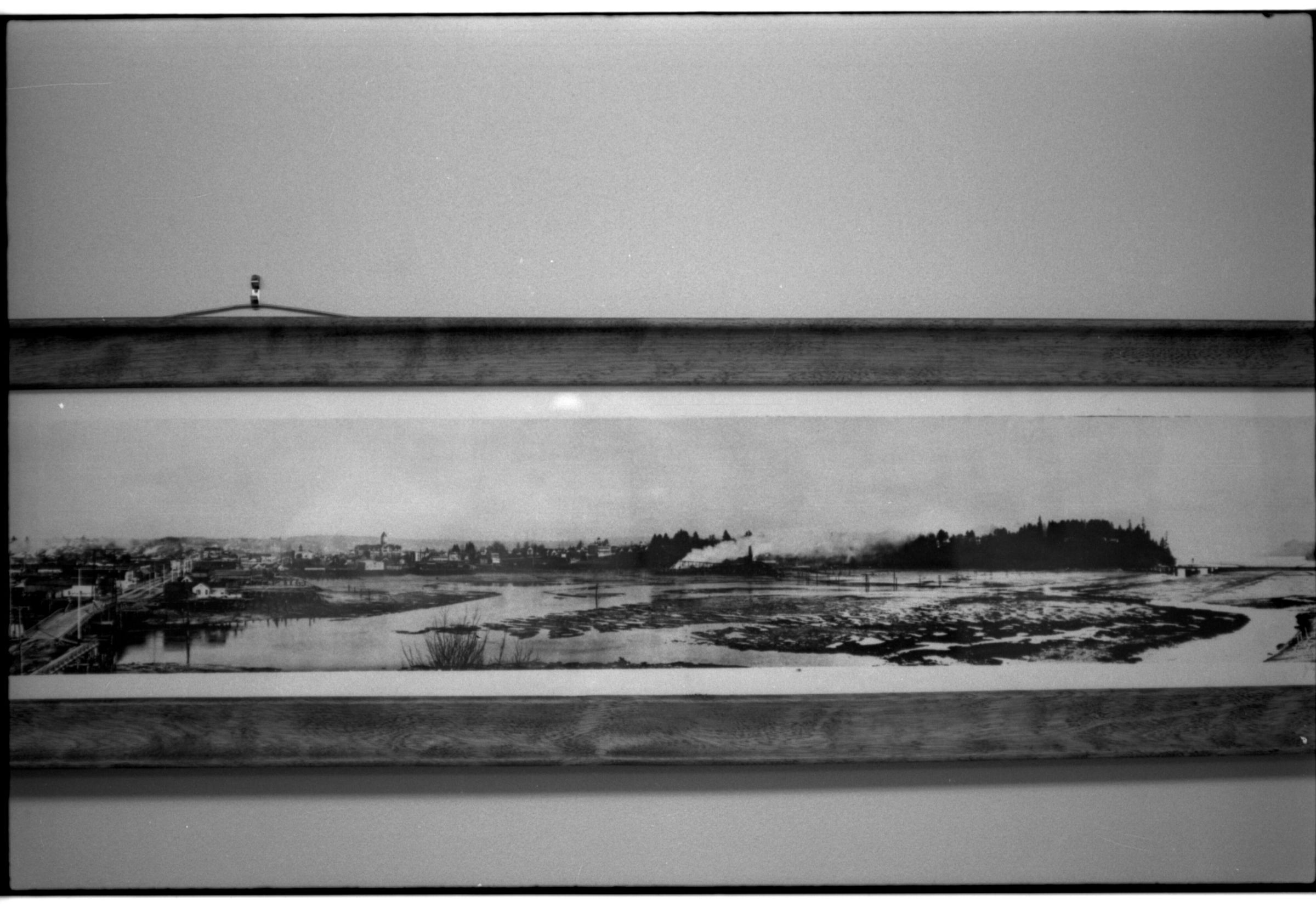 Negative, sheet film. 1 x 1.5 b&w. Panoramic photo of Olympia and harbor, taken from west shore of Budd Inlet, panning from north to south.
