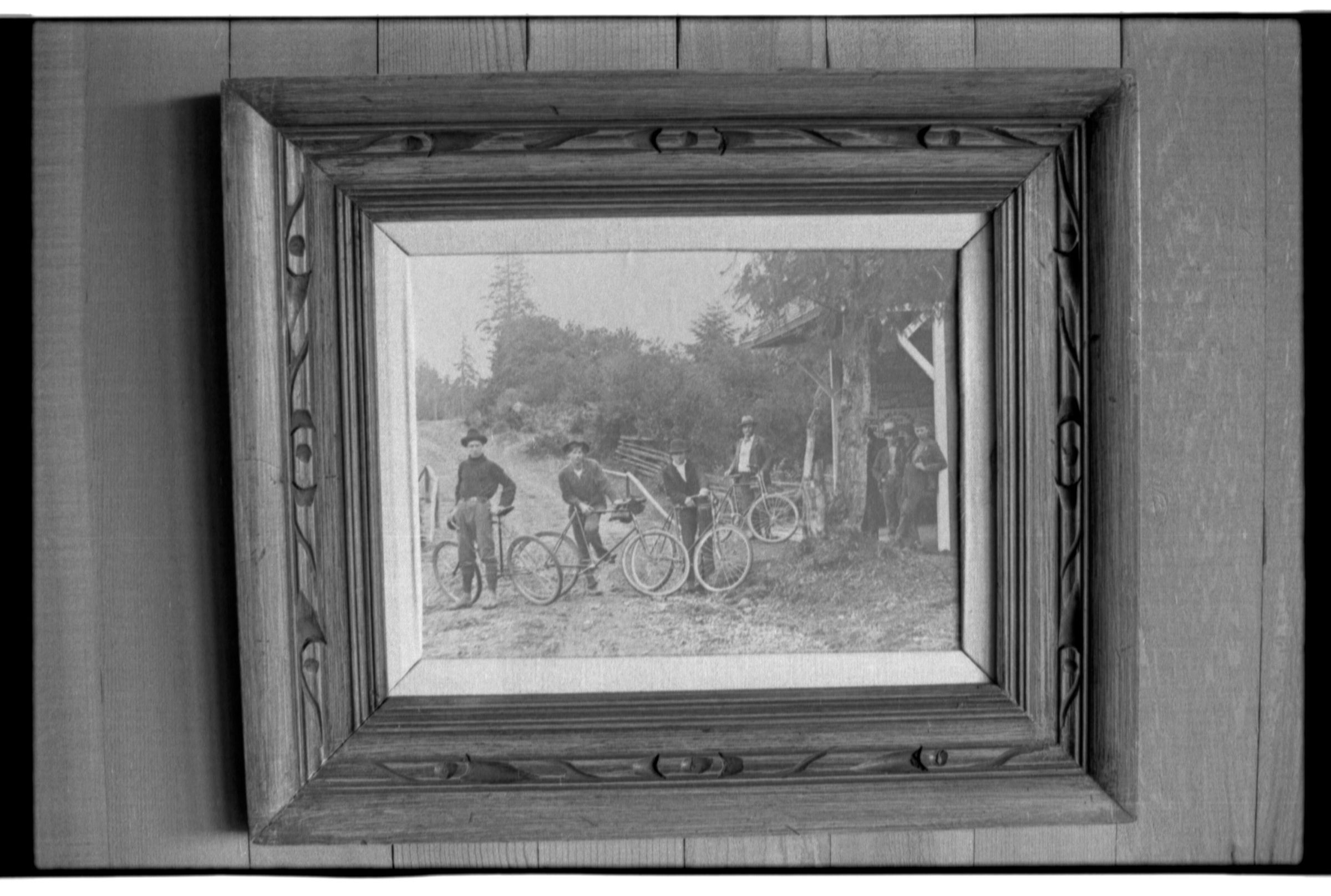 Negative, sheet film. 1 x 1.5 b&w. Oly Brew. Framed photo inventory. Men on bicycles, unknown location.