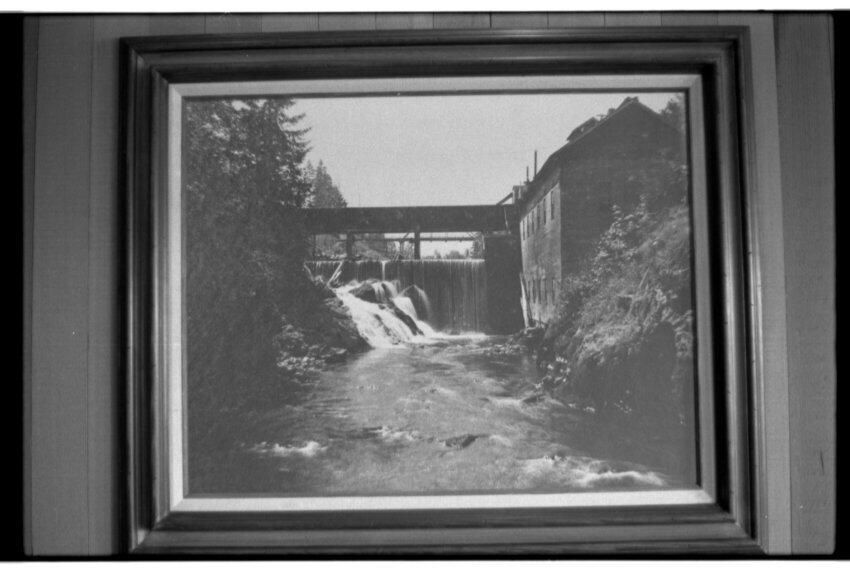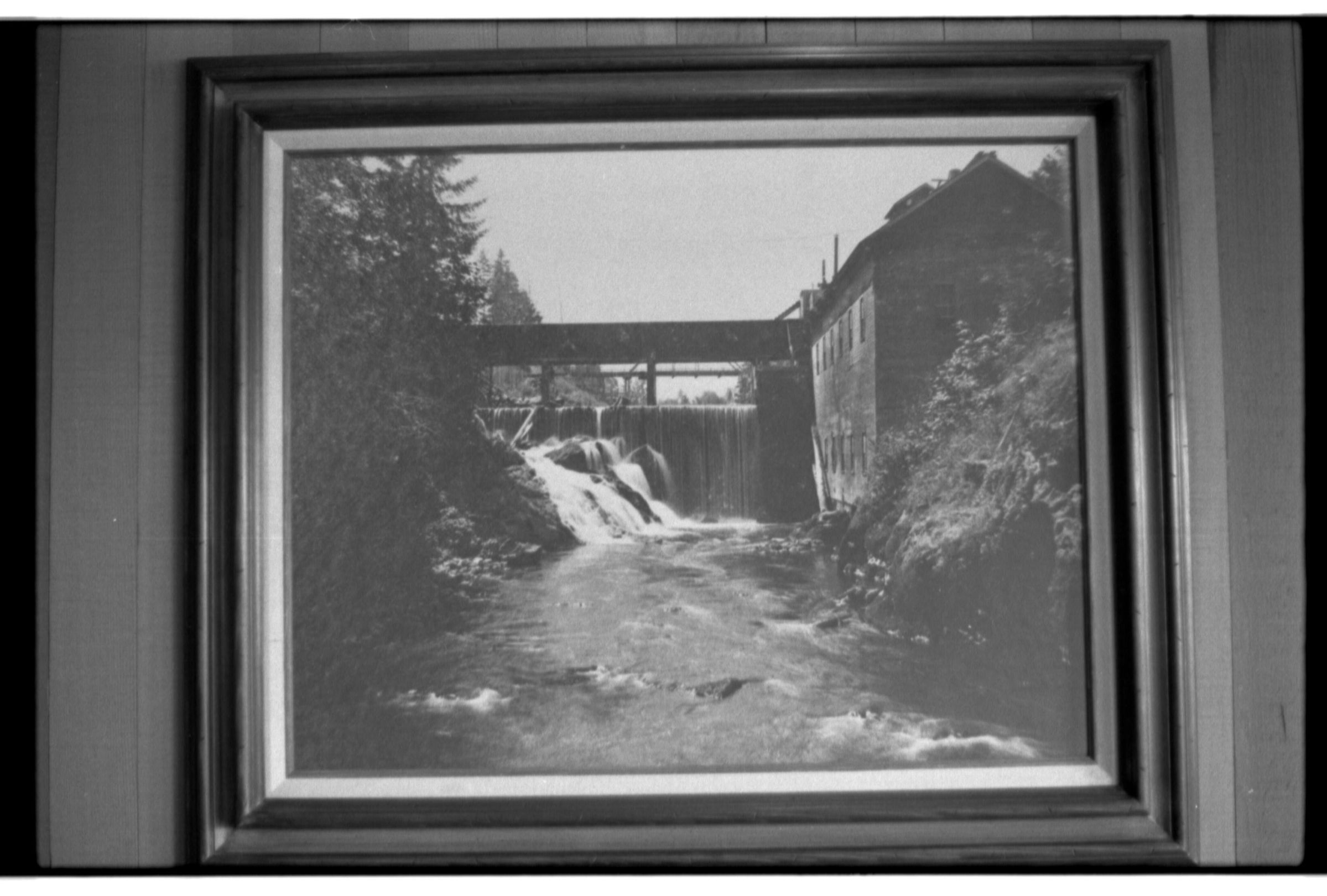 Negative, sheet film. 1 x 1.5 b&w. Oly Brew. Framed photo inventory. Middle falls of the Deschutes River, with Olympia Light & Power's powerhouse and dam.Other Names and Numbers