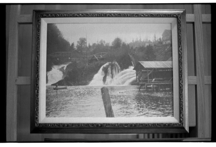 Negative, sheet film. 1 x 1.5 b&w. Oly Brew. Framed photo inventory. Lower falls of the Deschutes River, with early mill building on right.Other Names and Numbers