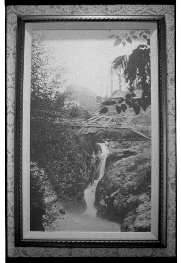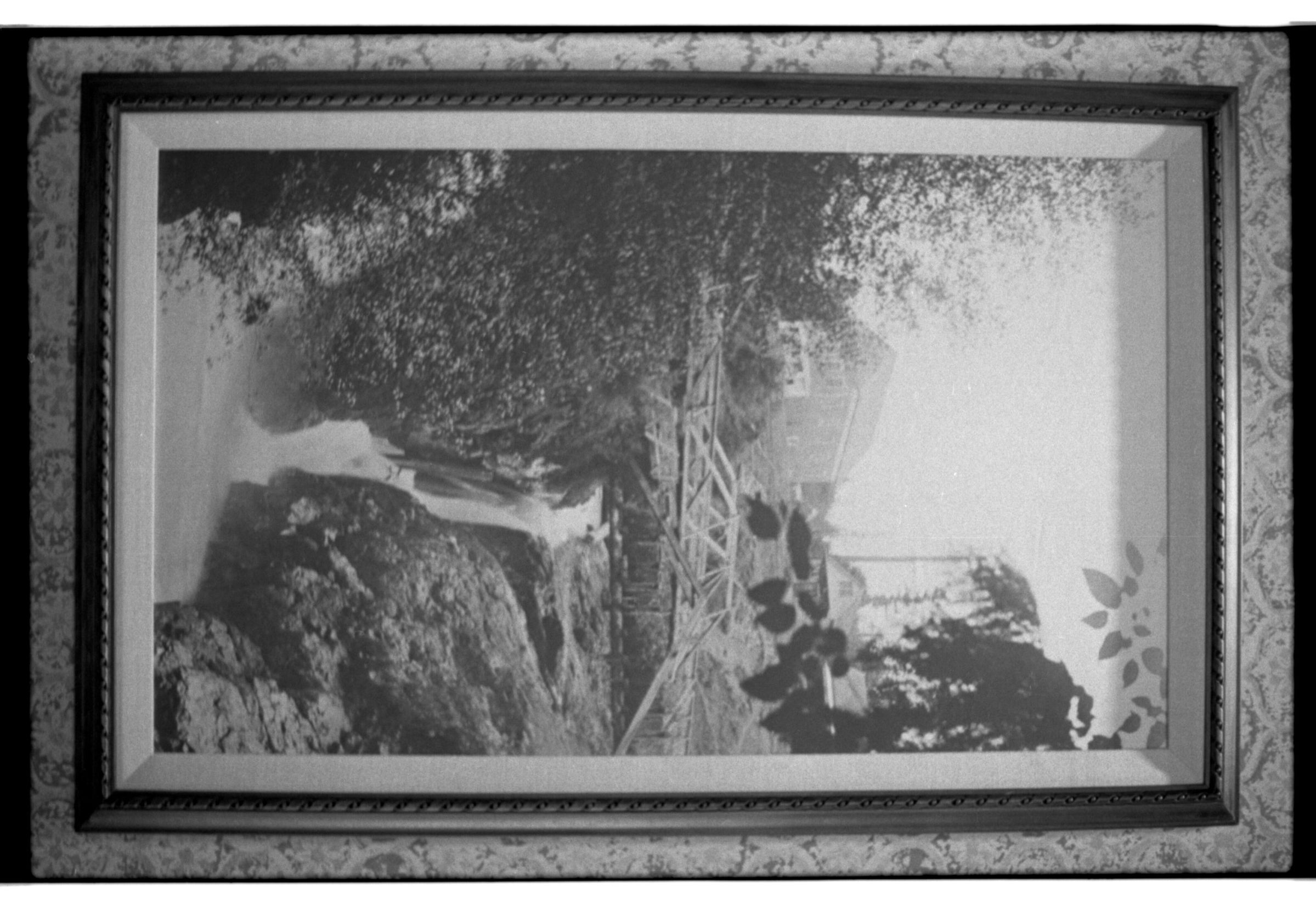 Negative, sheet film. 1 x 1.5 b&w. Oly Brew. Framed photo inventory. Falls on the Deschutes River with footbridge.