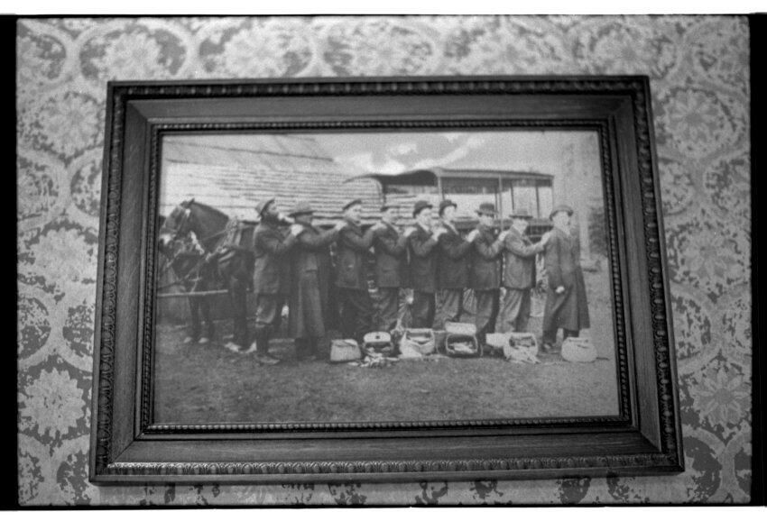 Negative, sheet film. 1 x 1.5 b&w. Oly Brew. Framed photo inventory. Cabin, horse team, and group of men with fishing creels. No ID on men. Unknown location.Other Names and Numbers