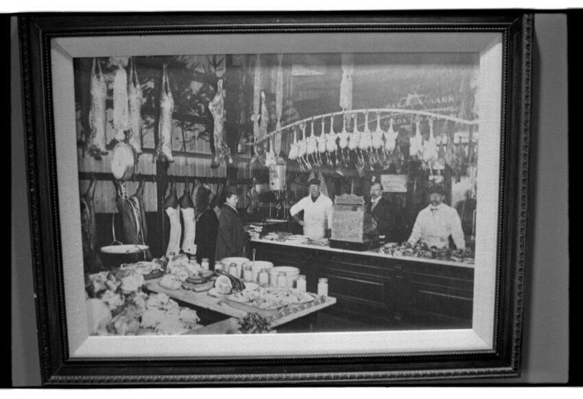 Negative, sheet film. 1 x 1.5 b&w. Oly Brew. Framed photo inventory. Meat market in Olympia. No ID on people.