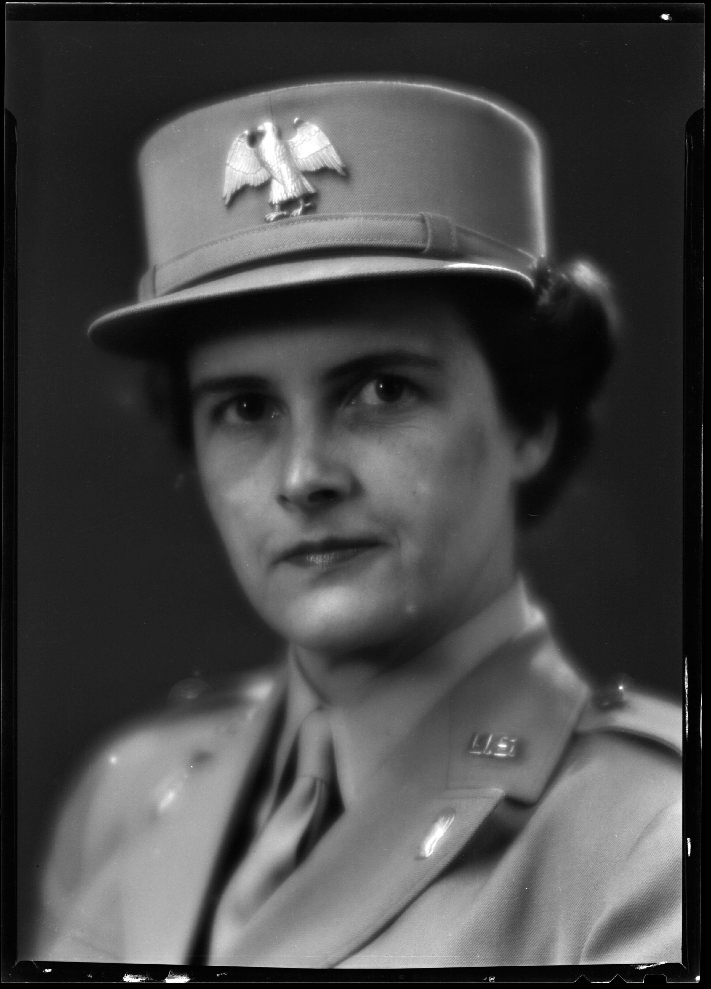Negative, sheet film. 7 x 5 b&w. No. 10455. Lt. Louise Schmidt, granddaughter of Leopold and Johanna Schmidt, daughter of Leo Jr.. 6/1942 or 8/1943.