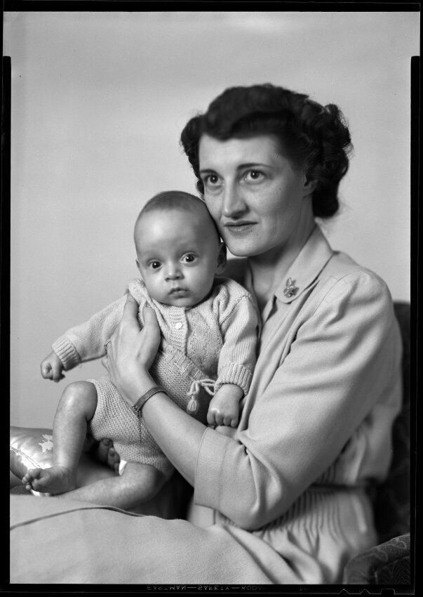Negative, sheet film. 7 x 5 b&w. No. 10671. Nick Schmidt, and mother Viriginia Schmidt (wife of Bink).