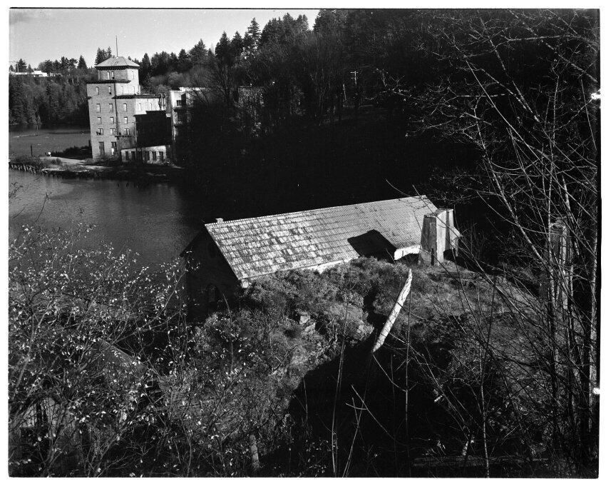 Negative, sheet film. 4 x 5 b&w. Olympia Light and Power Company built this powerhouse at the lower falls of the Deschutes River in 1904. The building was made of Tenino sandstone and housed 2 Westinghouse generators and 2 Victor turbines. The turbines were fed by a 9-foot diameter steel pipe that brought water from the upper falls, a drop of more than 74 feet. The powerhouse was abandoned in the early 1930s. Today, the foundation of the powerhouse serves as a viewing platform for the lower falls. The old Olympia brewery appears in the background.Name/Title