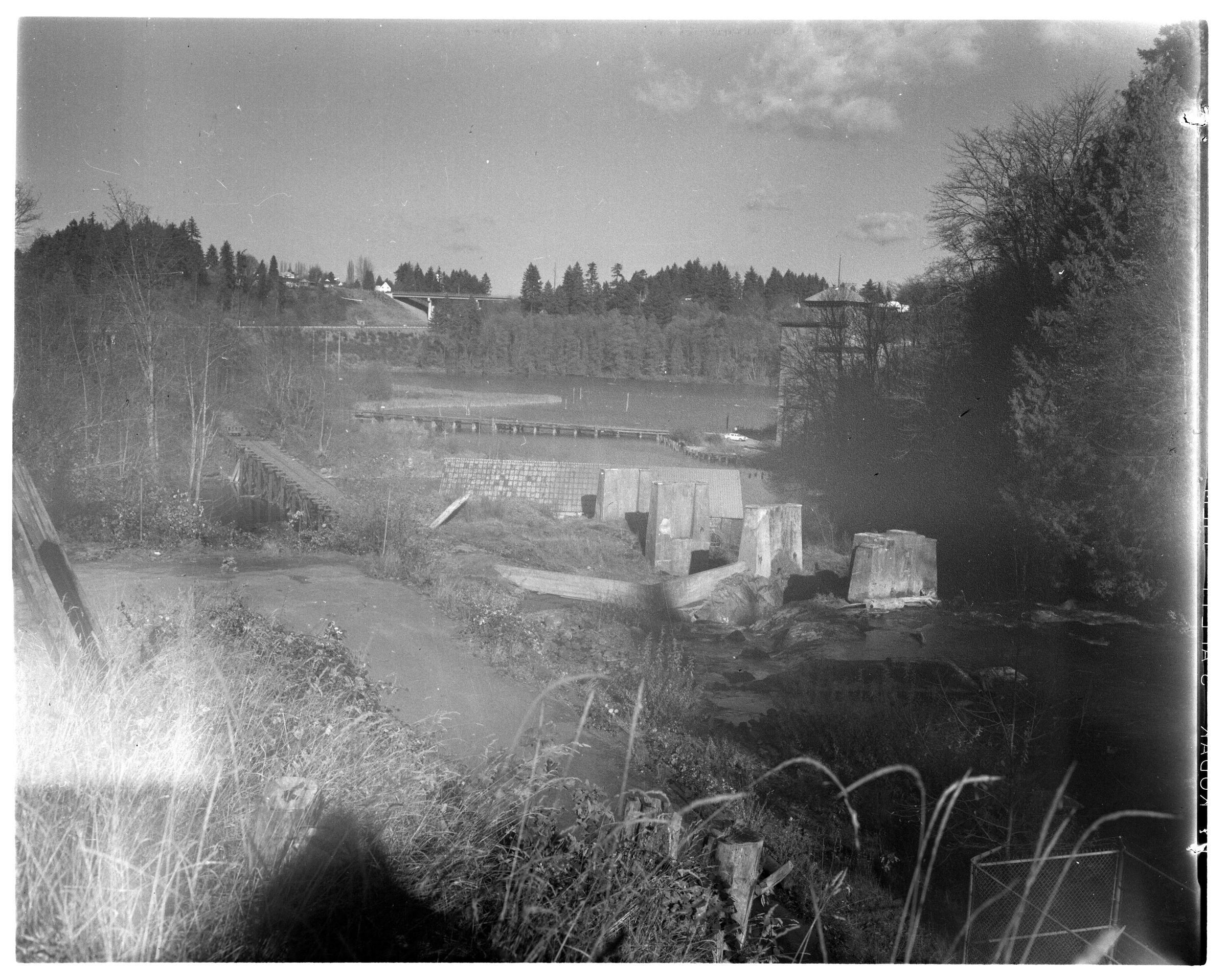 Negative, sheet film. 4 x 5 b&w. Olympia Light and Power Company built a powerhouse at the lower falls of the Deschutes River in 1904. The building was made of Tenino sandstone and housed 2 Westinghouse generators and 2 Victor turbines. The turbines were fed by a 9-foot diameter steel pipe that brought water from the upper falls, a drop of more than 74 feet. The powerhouse was abandoned in the early 1930s. Today, the foundation of the powerhouse serves as a viewing platform for the lower falls. The concrete pillars shown here supported the pipe/flume. The Olympia brewery appears in the background.Name/Title