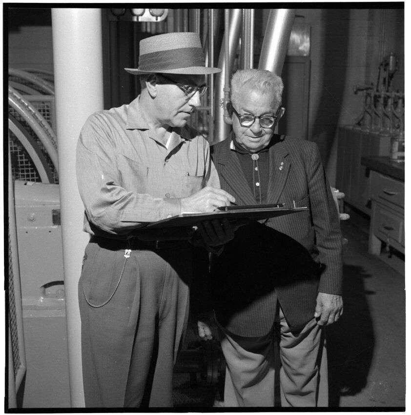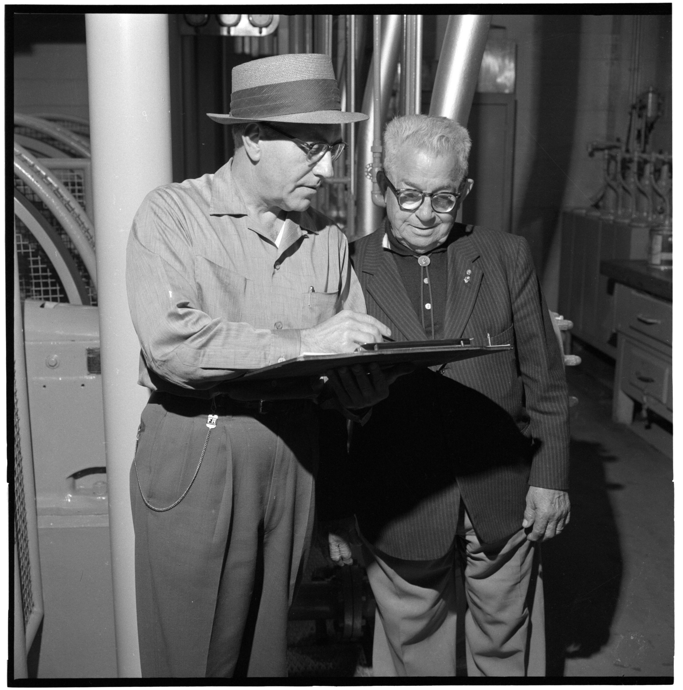 Negative, sheet film. 2.25 x 2.25 b&w. No. 583. Francis X. "Shorty" Diemert. Shorty came to Olympia in 1899 as a crewmember on a sternwheeler. In 1910 he began working for the Olympia brewery until Prohibition, when he had to find other work in the area. When Prohibition was repealed in 1933, Peter G. Schmidt asked Shorty when he could come to work at the new brewery. Shorty answered "Right now." He eventually became, in his words, "chief engineer in one of the finest breweries in the world." No ID on man on left.Name/Title