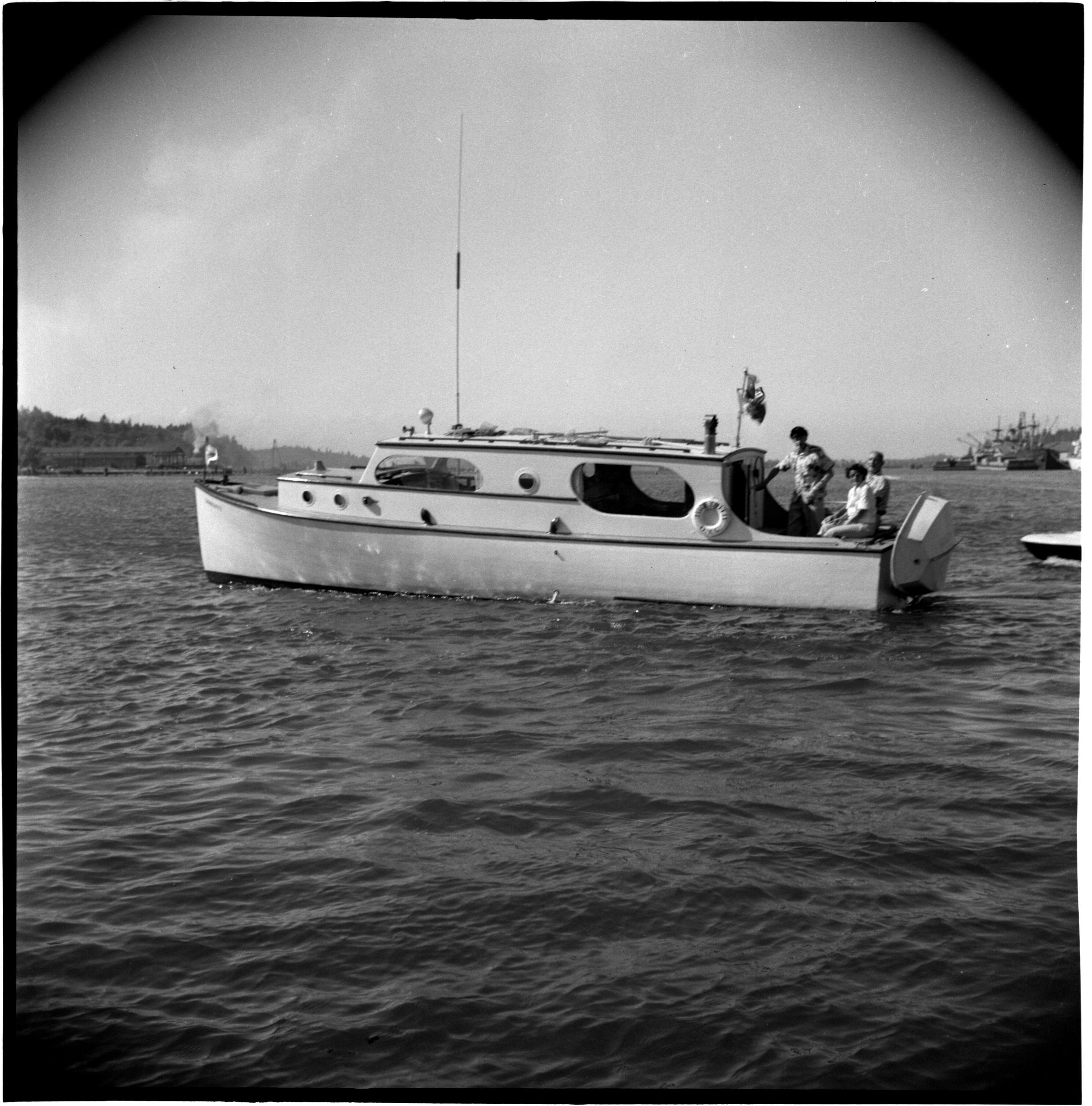 Negative, sheet film. 2.25 x 2.25 b&w. No. 583. Yachters. Hideout II, Captain Lyle Premo, guests Lilly Premo and Bill Strock.