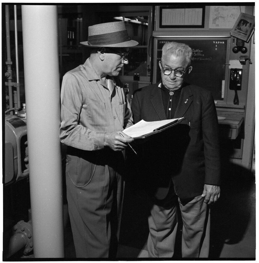 Negative, sheet film. 2.25 x 2.25 b&w. No. 583. Francis X. "Shorty" Diemert. Shorty came to Olympia in 1899 as a crewmember on a sternwheeler. In 1910 he began working for the Olympia brewery until Prohibition, when he had to find other work in the area. When Prohibition was repealed in 1933, Peter G. Schmidt asked Shorty when he could come to work at the new brewery. Shorty answered "Right now." He eventually became, in his words, "chief engineer in one of the finest breweries in the world." No ID on other man.Name/Title