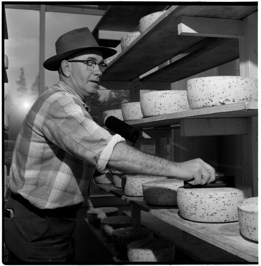 Negative, sheet film. 2.25 x 2.25 b&w. No. 540. Olympia Cheese Co. Co-owner Beck Hansen shows off Danish cheese at his plant on the Tacoma Highway just out of town. See "It's the Water News" March 1958 for story.Name/Title