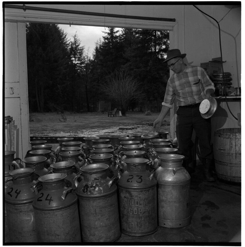 Negative, sheet film. 2.25 x 2.25 b&w. No. 540. Olympia Cheese Co. Co-owner Beck Hansen with 10-gallon milk cans at his plant on the Tacoma Highway just out of town. See "It's the Water News" March 1958 for story.Name/Title