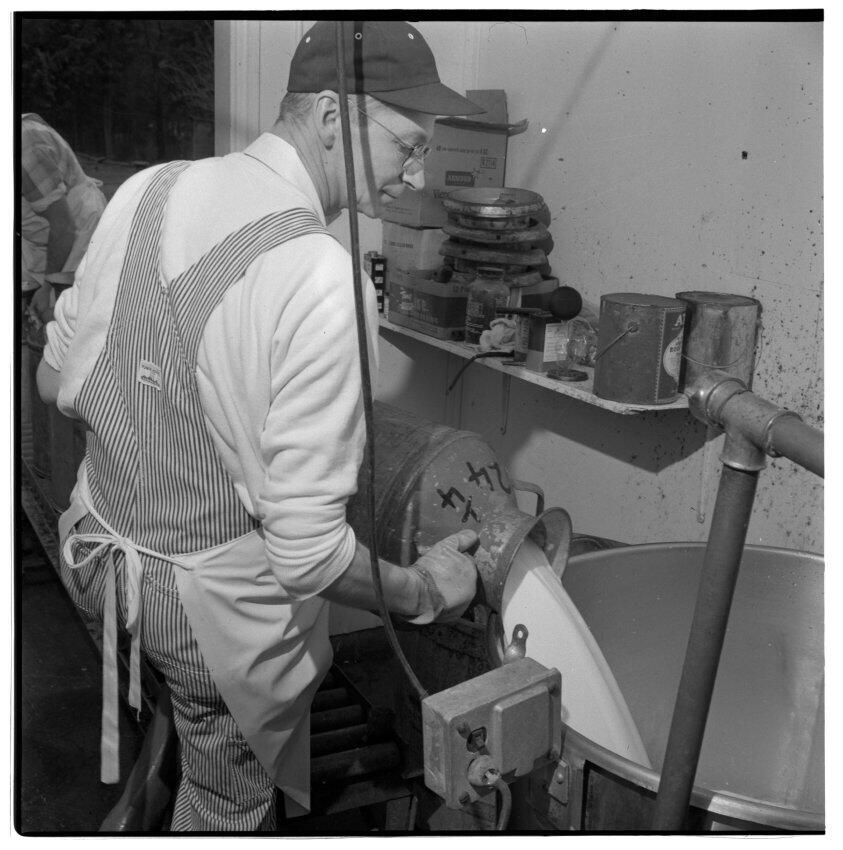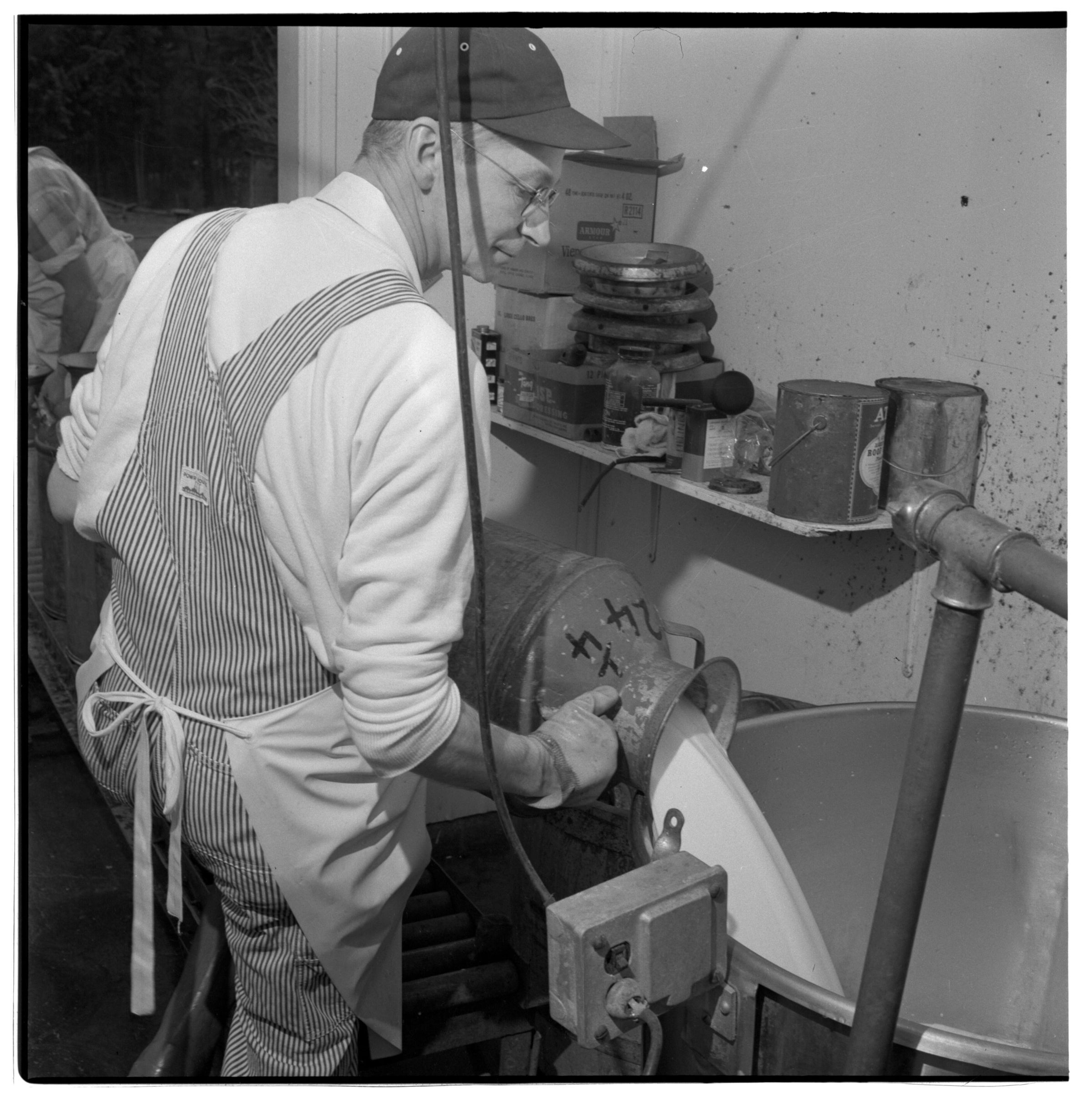 Negative, sheet film. 2.25 x 2.25 b&w. No. 540. Olympia Cheese Co. Co-owner Harry Nelson pours milk into filter unit at his plant on the Tacoma Highway just out of town. See "It's the Water News" March 1958 for story.Name/Title