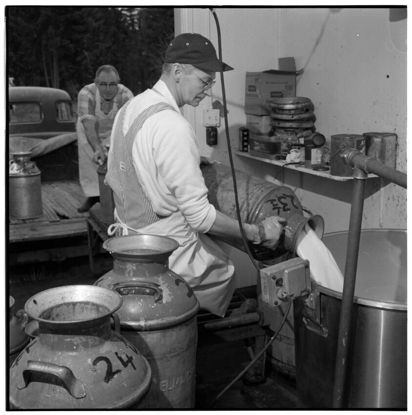 Negative, sheet film. 2.25 x 2.25 b&w. No. 540. Olympia Cheese Co. Co-owner Harry Nelson pours milk into filter unit at his plant on the Tacoma Highway just out of town. See "It's the Water News" March 1958 for story.Name/Title