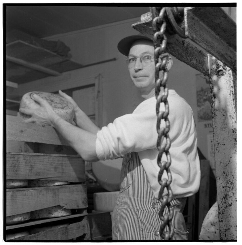 Negative, sheet film. 2.25 x 2.25 b&w. No. 540. Olympia Cheese Co. Co-owner Harry Nelson checks cheese at his plant on the Tacoma Highway just out of town. See "It's the Water News" March 1958 for story.Name/Title
