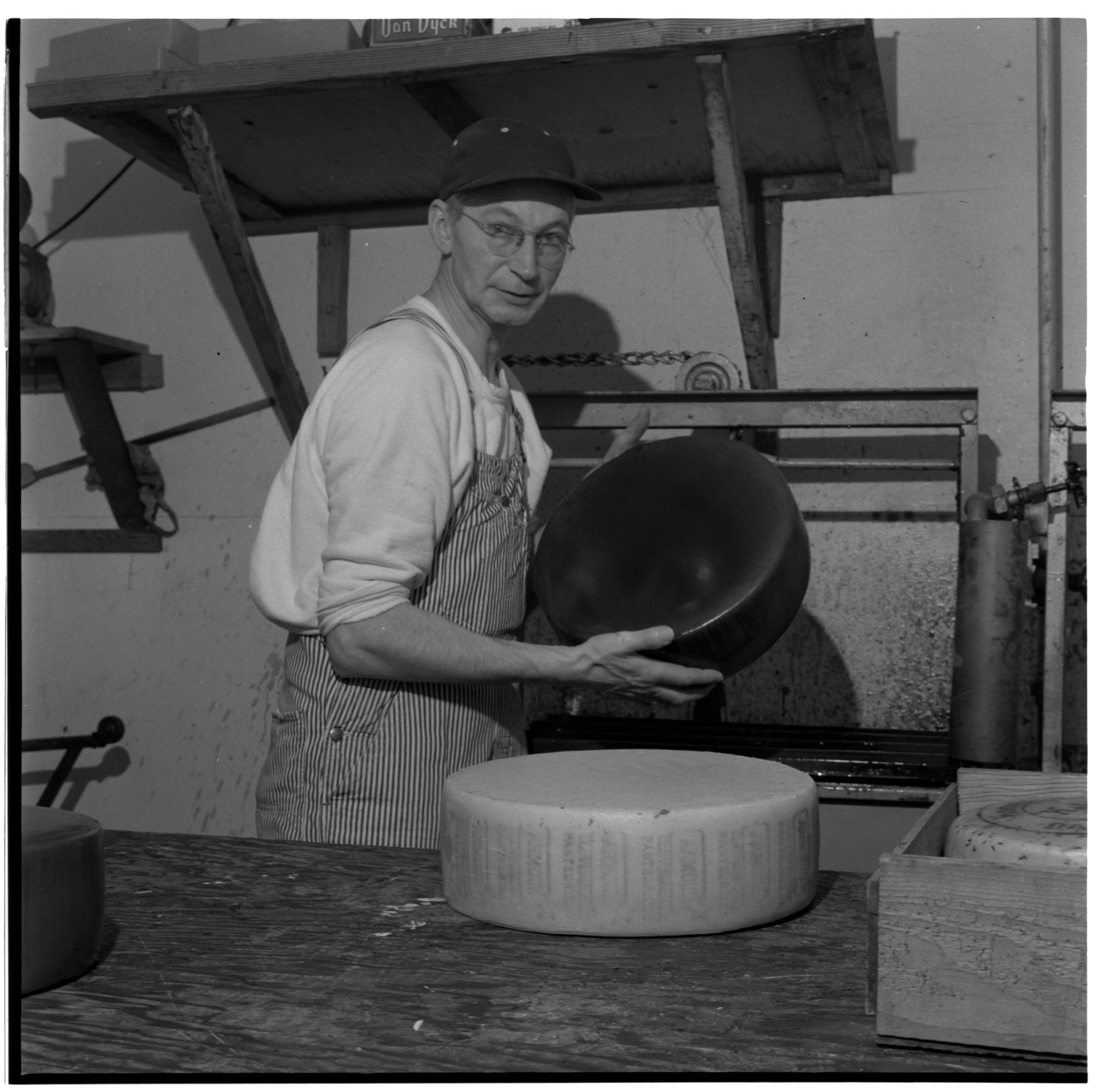 Negative, sheet film. 2.25 x 2.25 b&w. No. 540. Olympia Cheese Co. Co-owner Harry Nelson dips a cured wheel of cheese at his plant on the Tacoma Highway just out of town. See "It's the Water News" March 1958 for story.Name/Title