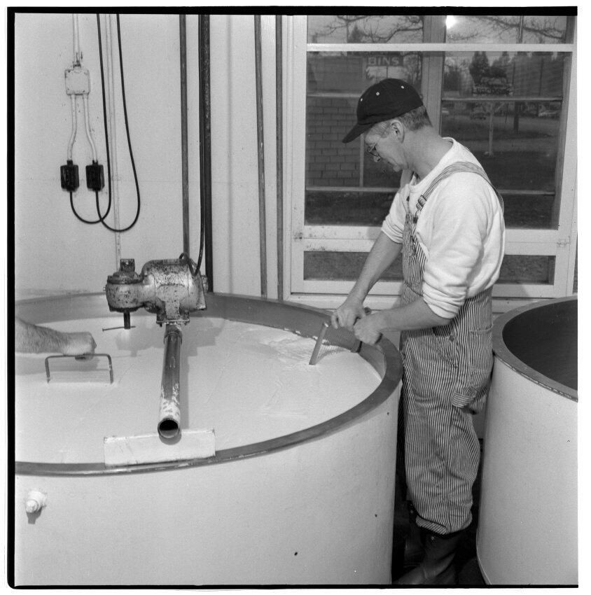 Negative, sheet film. 2.25 x 2.25 b&w. No. 540. Olympia Cheese Co. Co-owner Harry Nelson uses stainless steel knife set-up to cut curds at his plant on the Tacoma Highway just out of town. See "It's the Water News" March 1958 for story.Name/Title