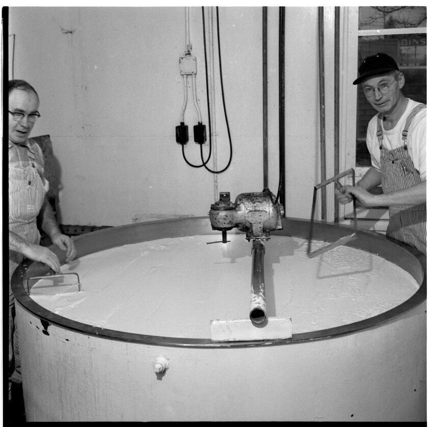 Negative, sheet film. 2.25 x 2.25 b&w. No. 540. Olympia Cheese Co. Co-owners Beck Hansen and Harry Nelson use stainless steel knife set-up to cut curds at their plant on the Tacoma Highway just out of town. See "It's the Water News" March 1958 for story.Name/Title