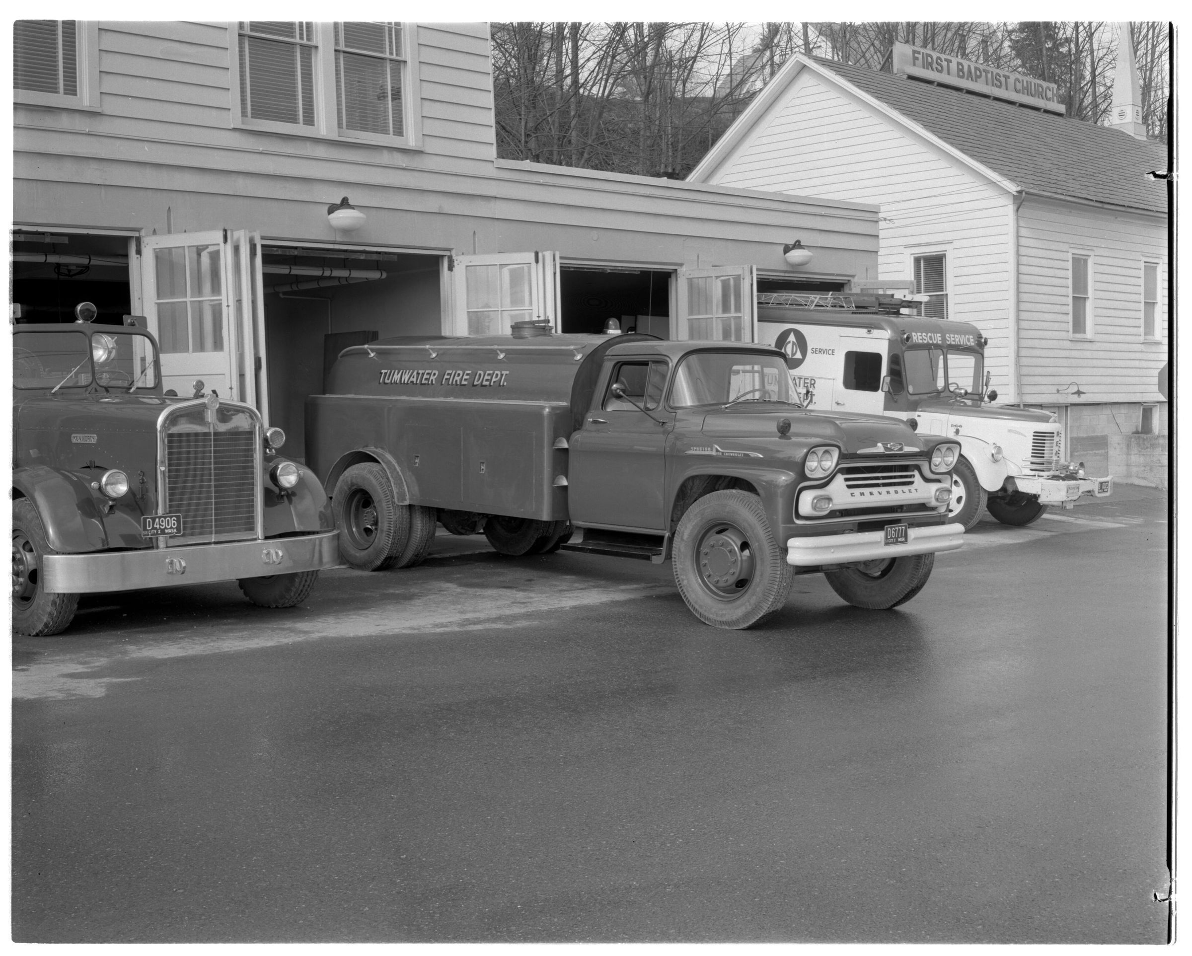 Negative, sheet film. 4 x 5 b&w. No. 541. Tumwater Fire Department, located on first floor of old Tumwater City Hall at 2nd Avenue and Custer. Building was constructed in 1939.