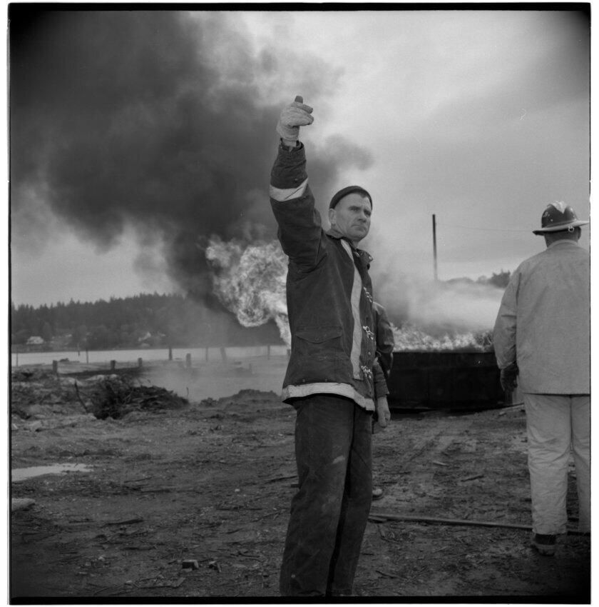 Negative, sheet film. 2.25 x 2.25 b&w. No. 541. Tumwater Fire Department at fire. No ID on men.