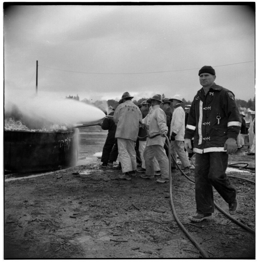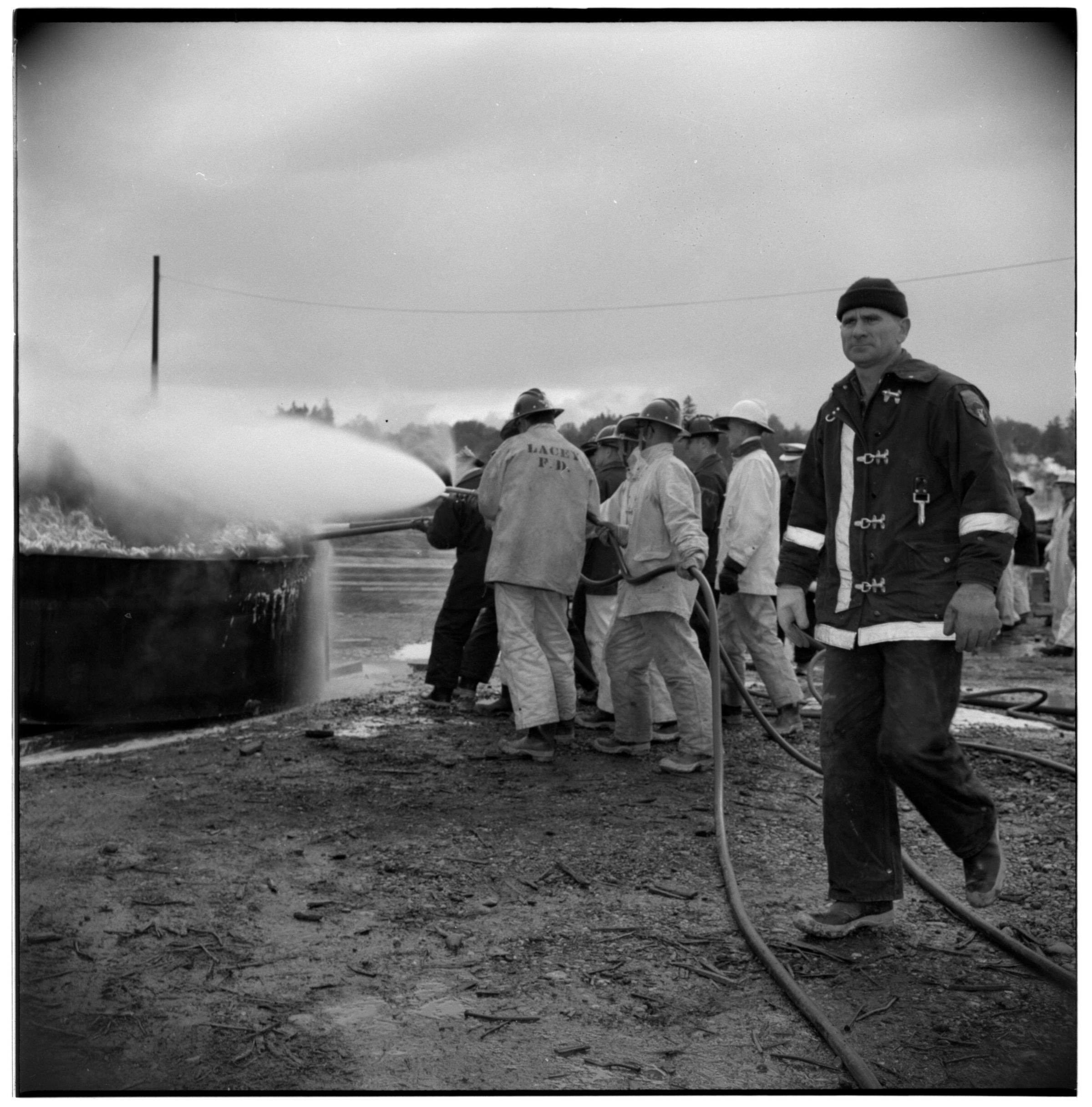 Negative, sheet film. 2.25 x 2.25 b&w. No. 541. Tumwater Fire Department at fire. No ID on men.
