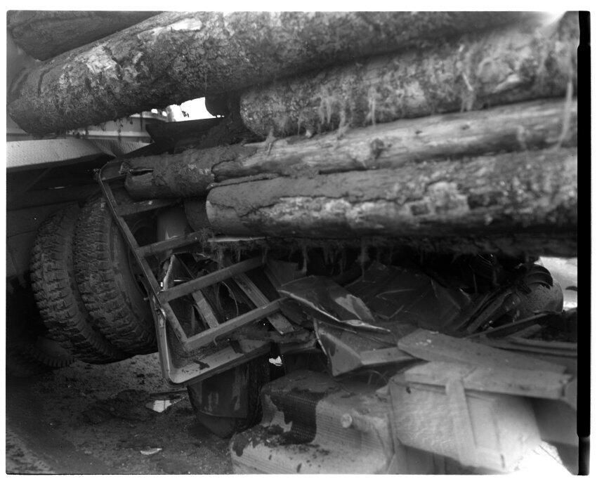 Negative, sheet film. 4 x 5 b&w. No. 782. Logging truck wrecked on Interstate 5.