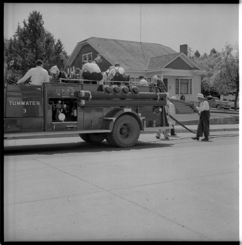 Negative, sheet film. 2.25 x 2.25 b&w. No. 306. Tumwater Fire Department at practice. No ID on people.
