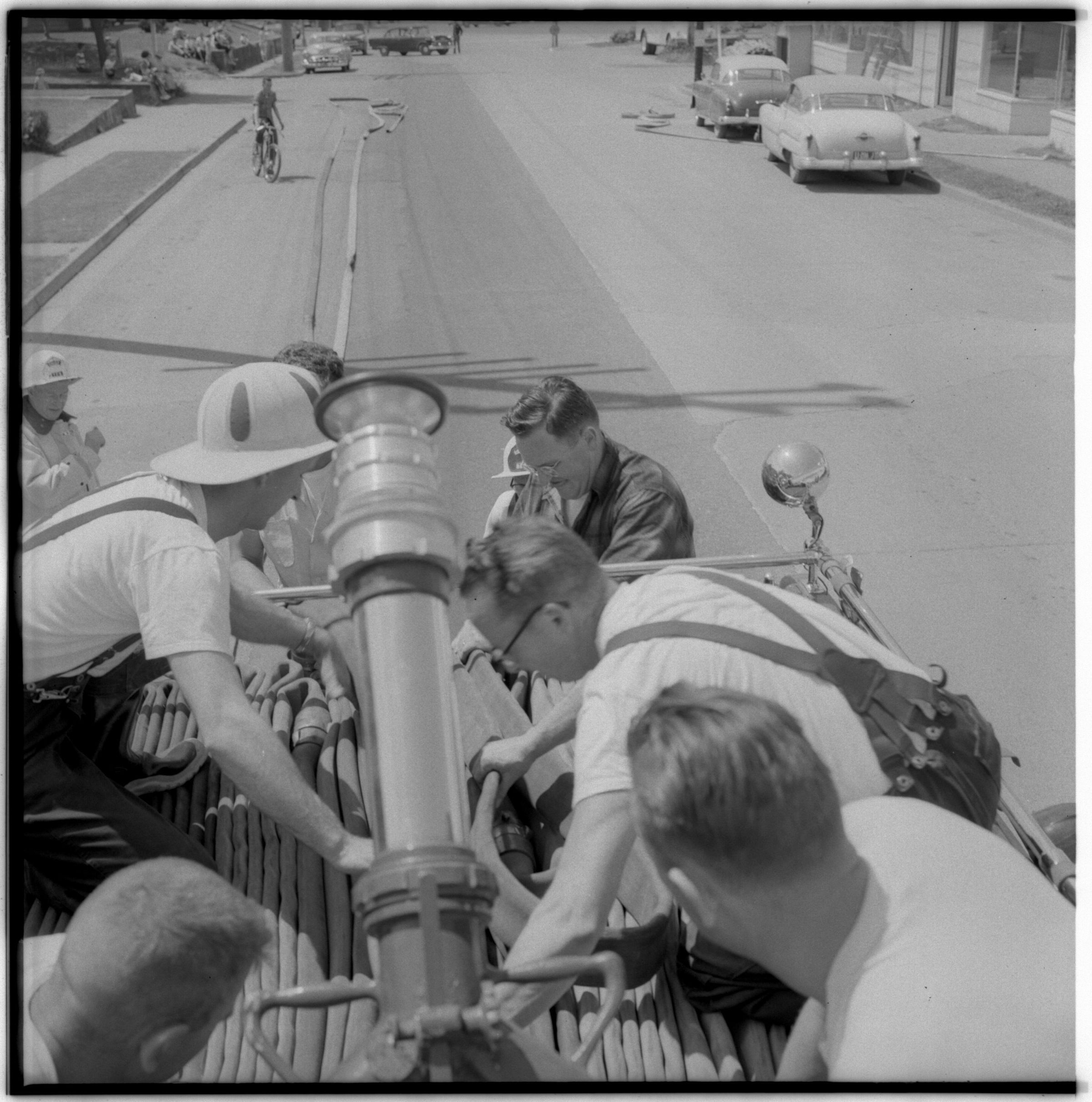 Negative, sheet film. 2.25 x 2.25 b&w. No. 306. Tumwater Fire Department at practice. No ID on people.